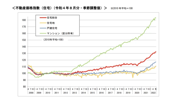 [부동산가격지수 (주택) 2022년 8월 기준] 주택총합 (레드), 주택지 (옐로우), 단독주택 (블루), 맨션 (그린)