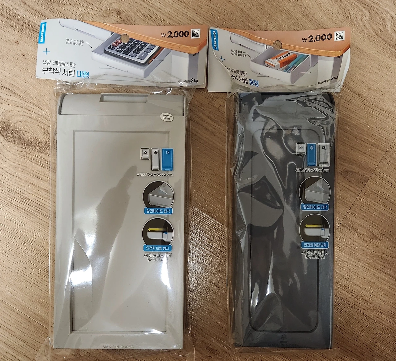 책상 아래 부분에 부착형 수납함을 붙여 간단한 필기류나 이어폰 등 자잘한 잡동사니를 수납할 수 있다