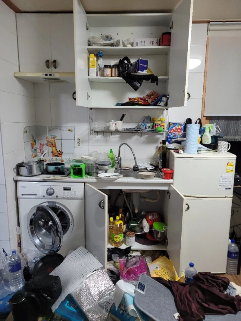 근데 주방 아래쪽 다리 부분에 틈이 있었는데 거기 물든 아이스팩이 한가득 쌓여있었다