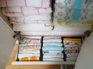 이불의 자리를 정할 땐 보관용 이불을 맨 밑으로 보내고 잘 쓰는 이불을 위로 올린다.