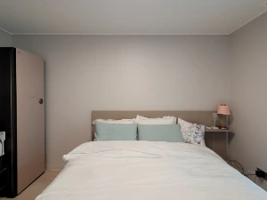 뽀송하고 단정한 이불세팅에 은은한 조명, 군더더기 없는 주변 환경