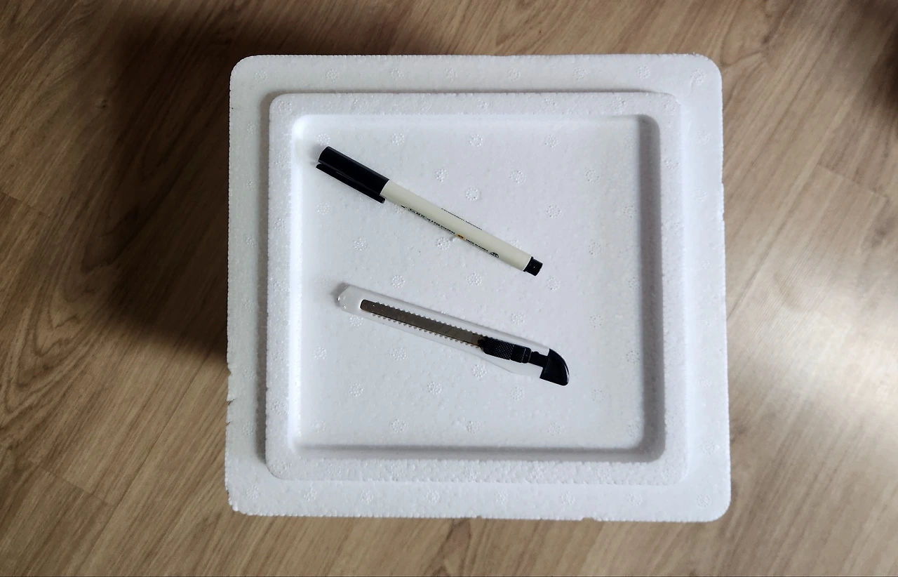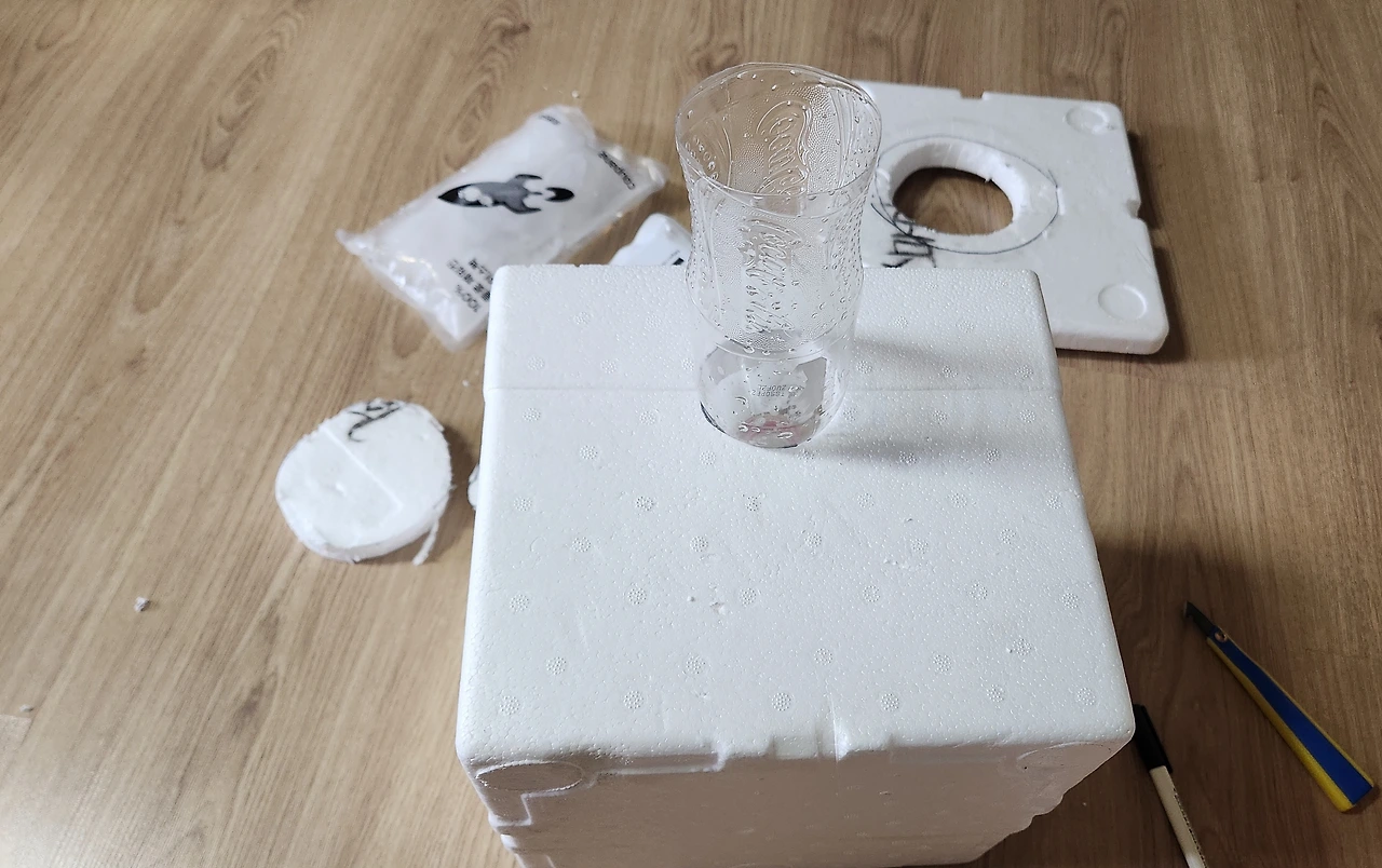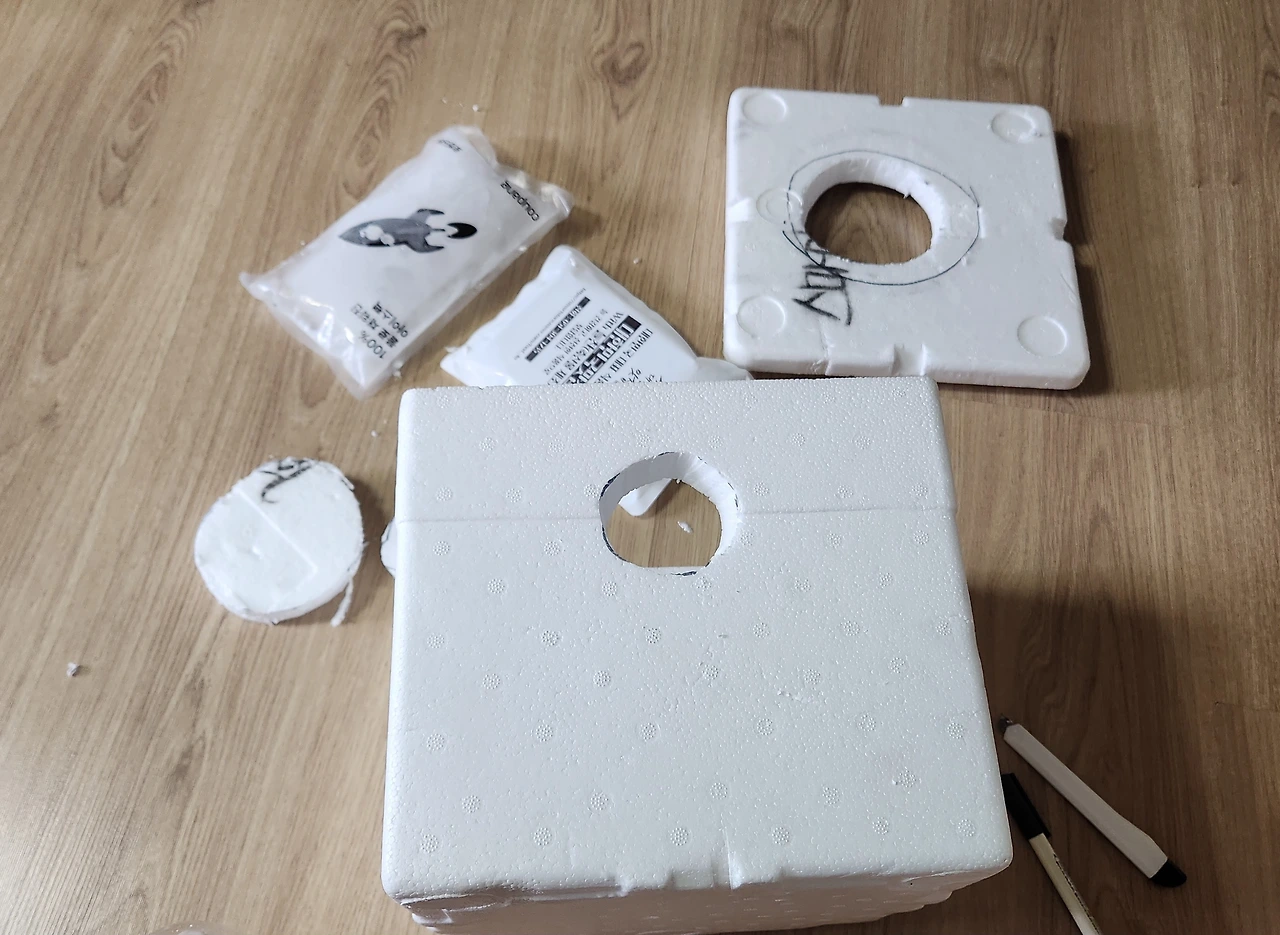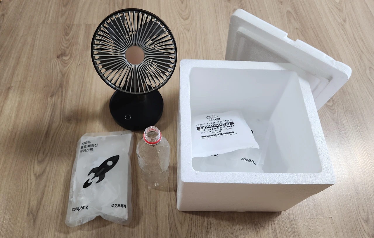 스티로폼 택배 박스, 미니 선풍기, 페트병, 펜, 문구 칼