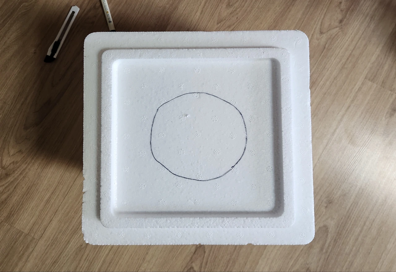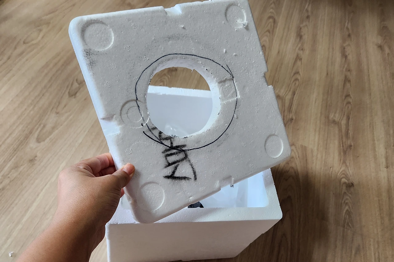 1. 박스 뚜껑에 선풍기 머리가 들어갈 구멍을 뚫는다