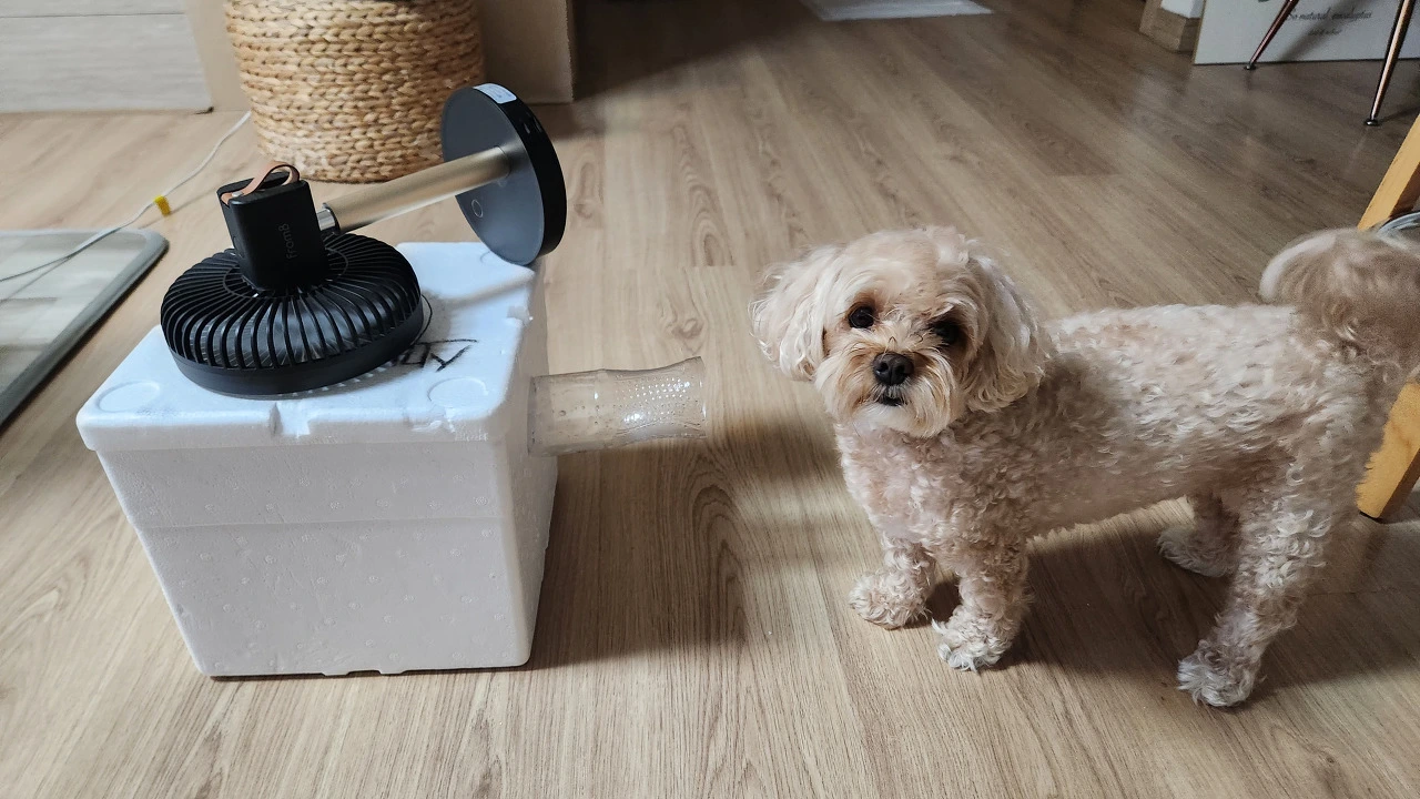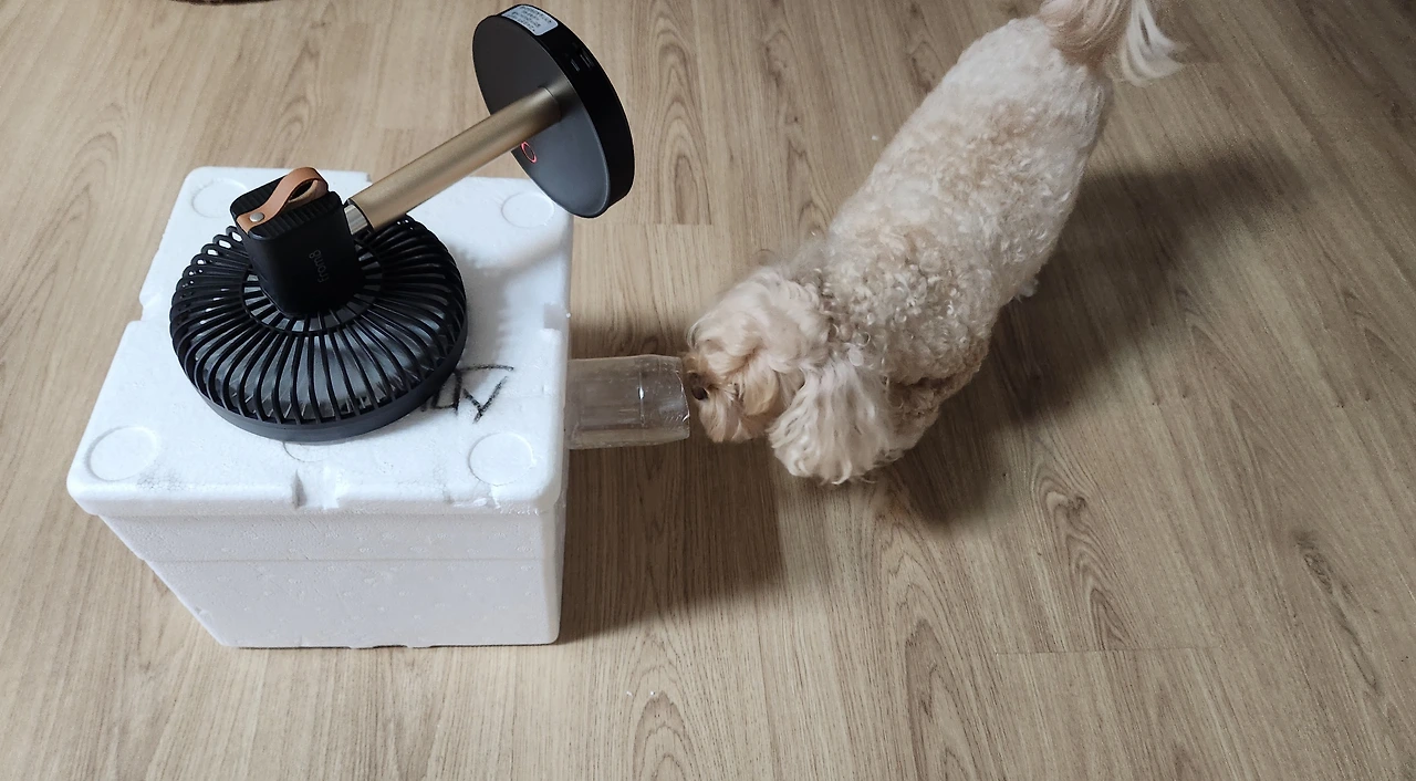 플라스틱 입구로 시원한 바람이 나오니 우리 집 똥 강아지가 좋아라 한다