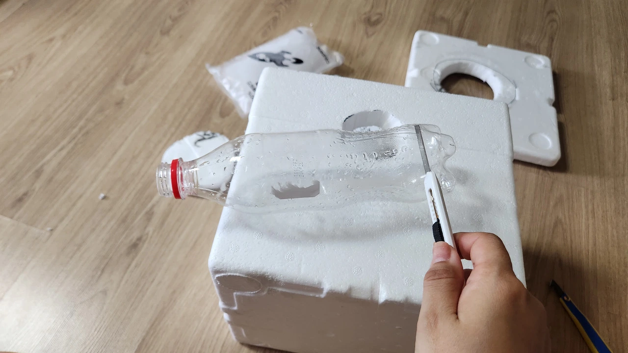 2. 바람이 나올 위치에 페트병이 들어갈 구멍을 뚫는다