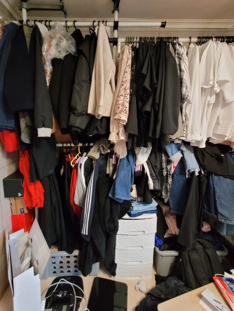 급한 대로 침대 위나 책상 의자 아무 데나 걸쳐 두다 보니 가뜩이나 어수선한 방의 생활감이 더 적나라하게 드러난다