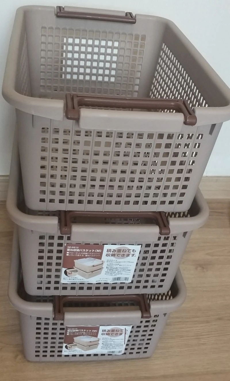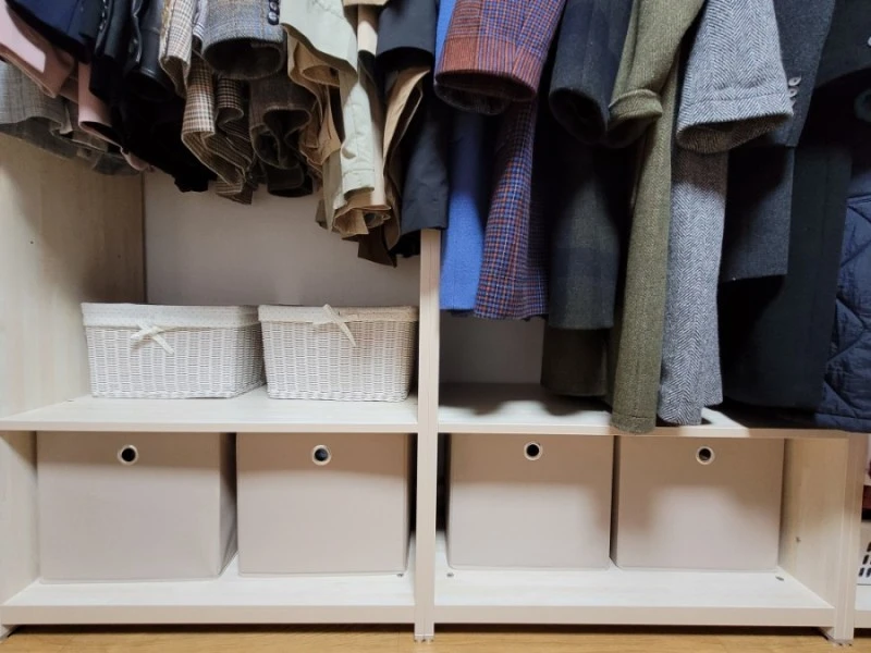 선반형 구조의 옷장은 그냥 옷을 바로 두는 것보다 바구니를 이용해 서랍 형 구조로 만들면 훨씬 편하다