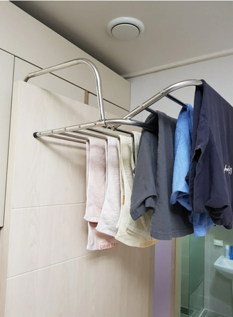 바닥보단 천장과 더 가까운 걸이식 건조대를 사용하는 게 더 효율적이라 할 수 있다