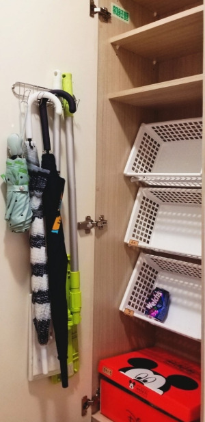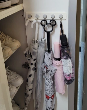 우산꽂이함이 없는 신발장은 스티커 수납도구로 벽에 걸어 보관한다