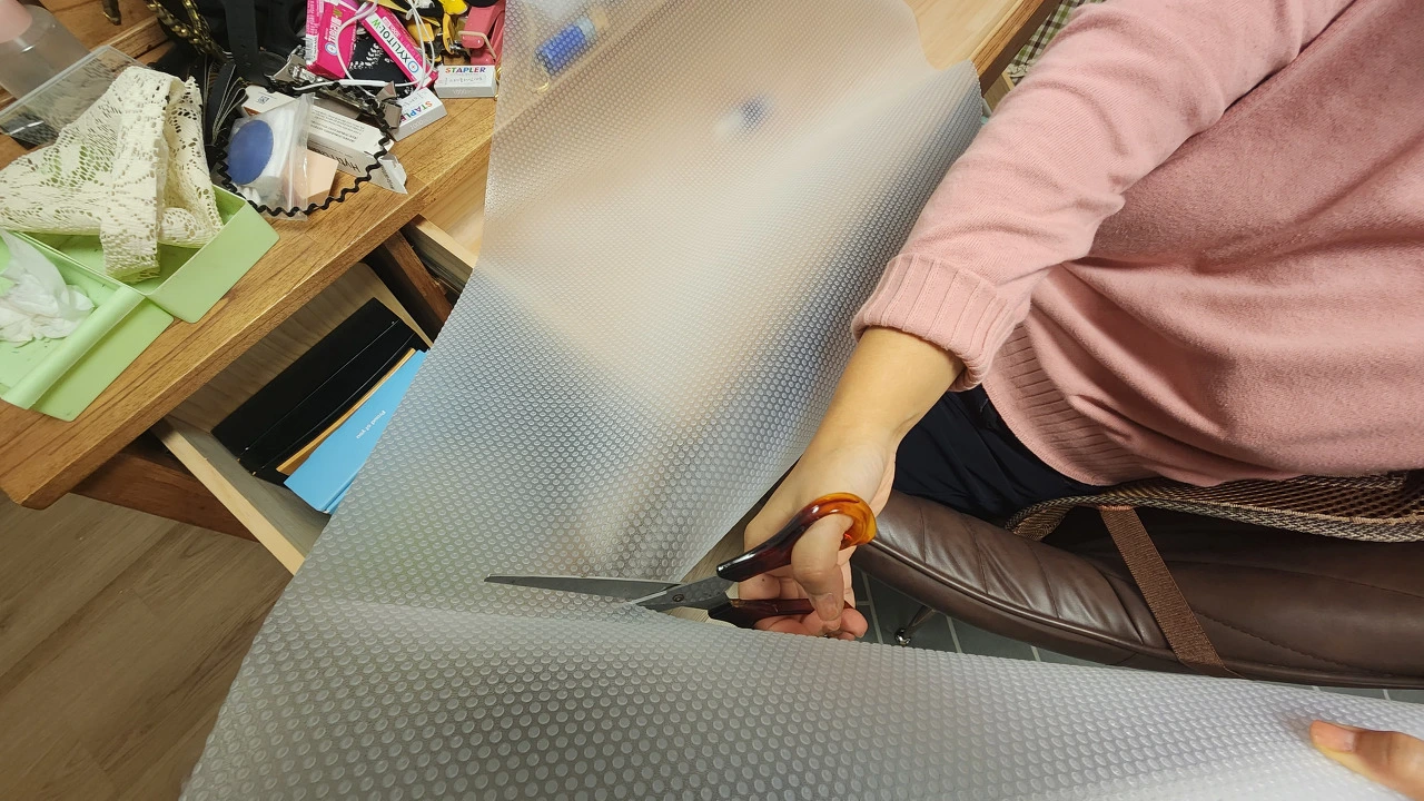 잘라 쓰는 투명 시트를 바닥에 깔면 이물질이 묻어도 닦기 쉽다