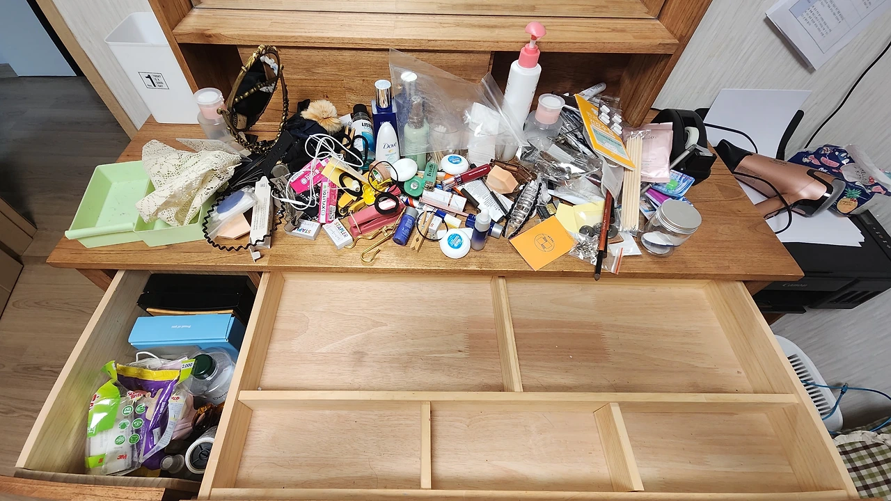 만약 엄두가 나지 않을 만큼 정리할 양이 많은 사람은 서랍과 화장대 위를 나눠서 해도 된다.