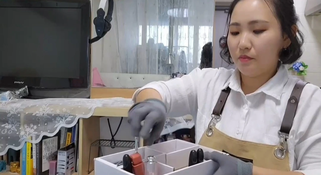 를 야무지게 깔고 화장대에 있는 화장품을 하나씩 내린다