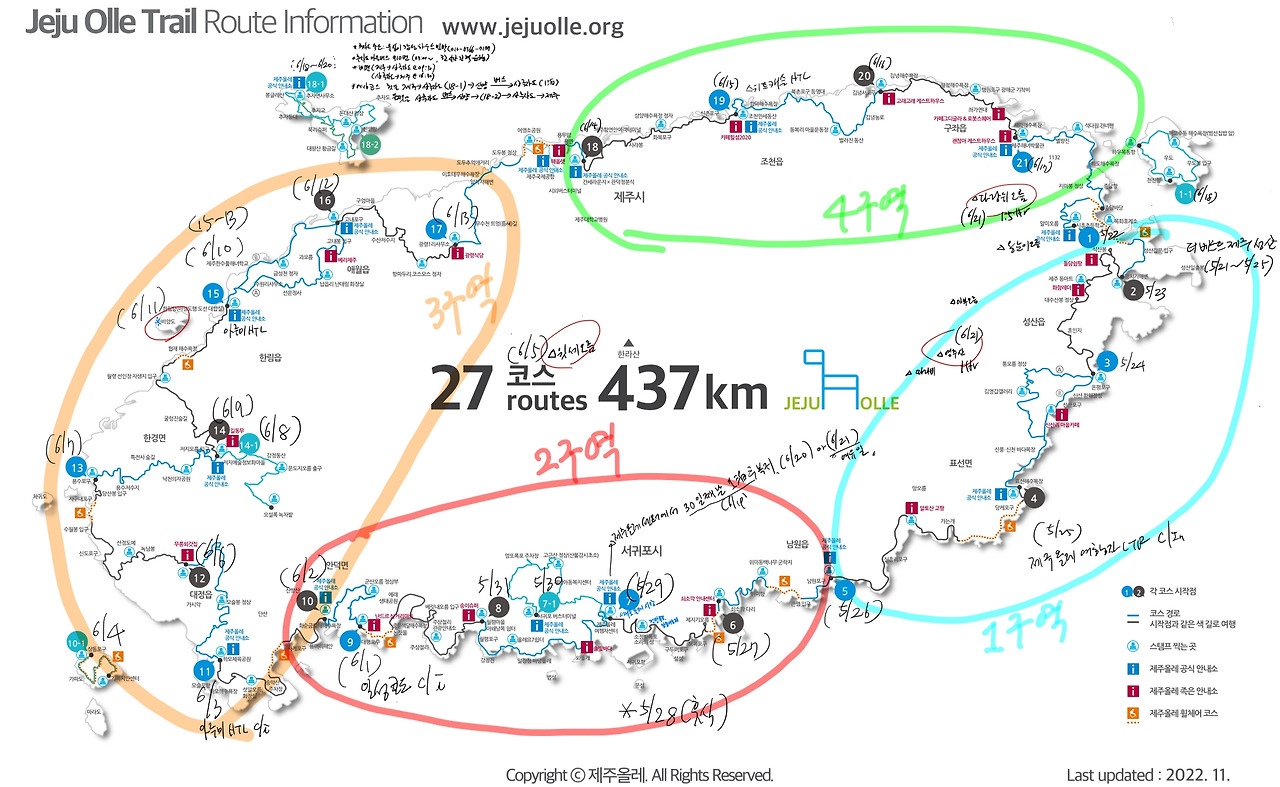 제주 올레길은 27개 코스에 총거리가 437Km이다.