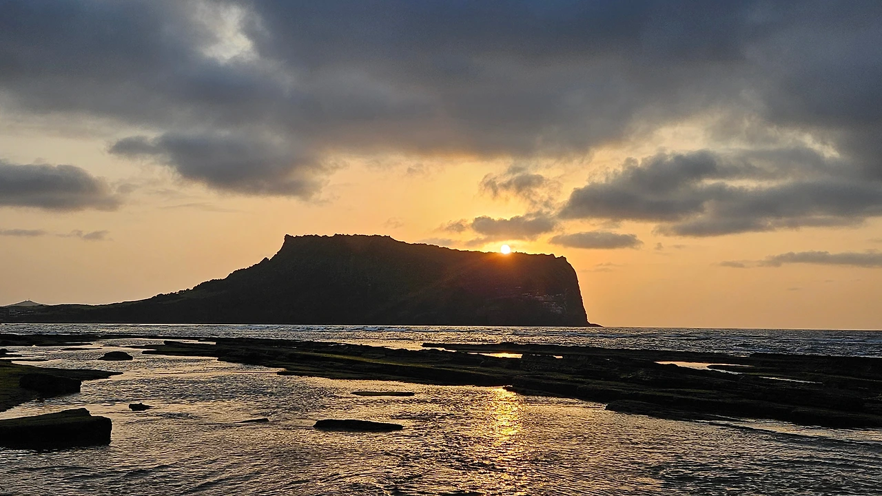 광치기 해변에서 바라본 성산 일출봉의 일출 (‘24.5.25) 봄날 이른 아침의 서늘한 기운 때문에 호텔로 돌아가고 싶은 유혹을 참고 기다린 끝에 일출을 마주할 수 있었다.