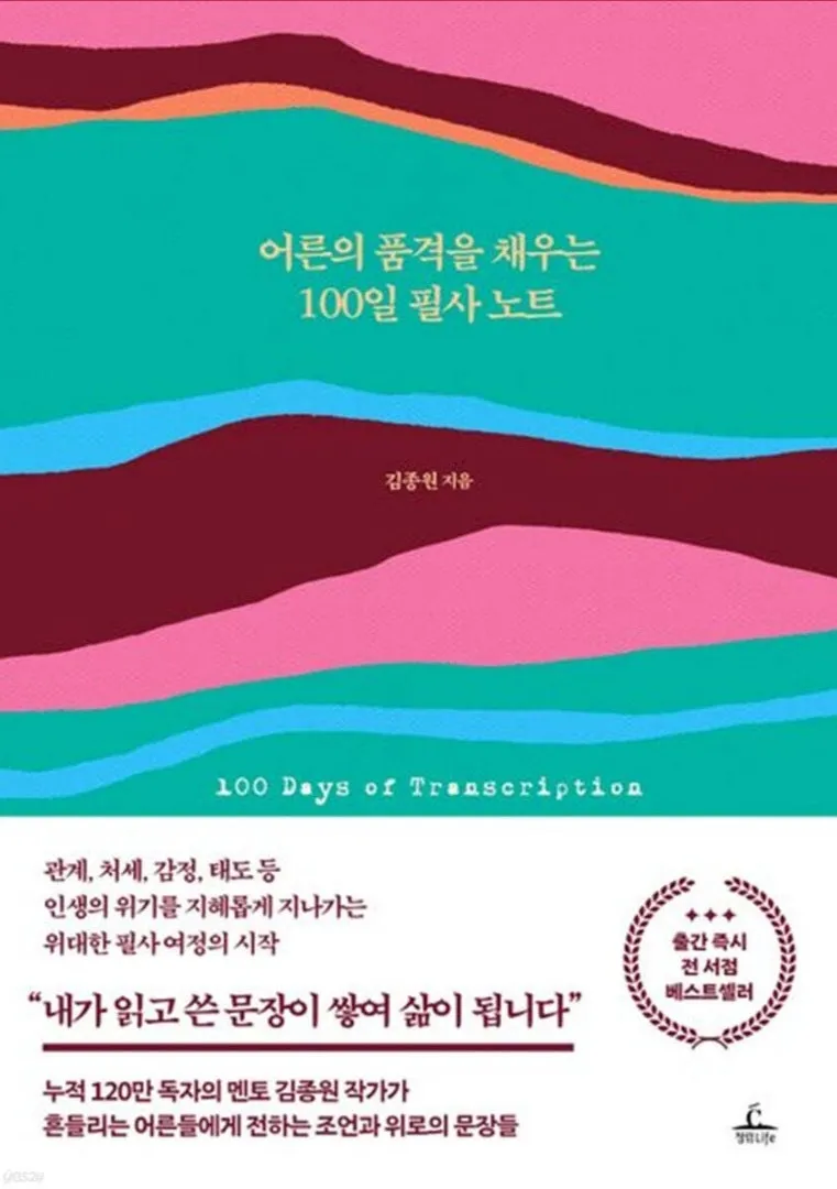 김종원 작가는 130권의 책을 쓰면서 30년을 글을 써왔다고 한다. 무명시절을 거쳐서 그런지 [내가 선택할 수 있는 품격 있는 태도에 관하여]는 우리가 마음이 고단할 때 읽으면 좋은 글들로 이루어져 있어서 정말 마음을 단단하게 해 준다. 그리고 [어른의 품격을 채우는 100일 필사 노트]에는 모두 주옥같은 좋은 문장들로 이루어져 있다. 품격 있는 어른으로 성장시켜 주는 품격 있는 글들로 꾸준히 필사를 하면서 성장할 수 있을 거 같다.