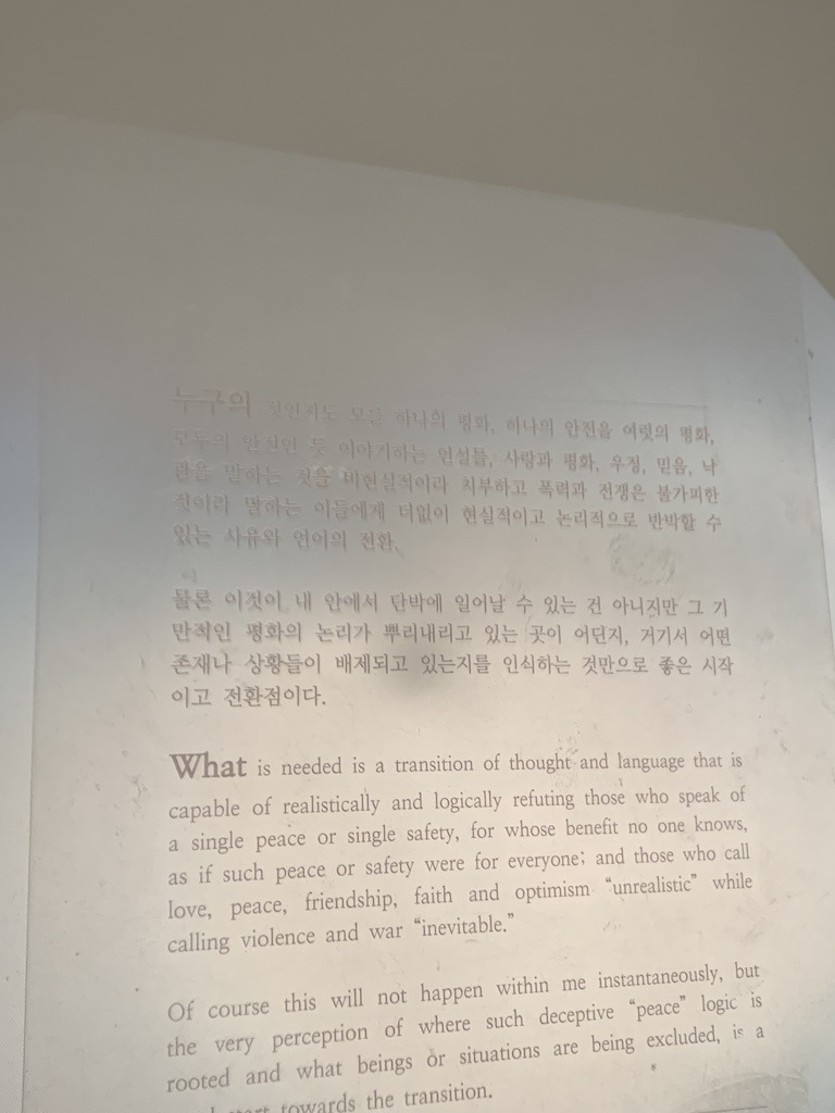 깔끔하고 경쾌한 느낌의 타이포 디자인과 달리, 텍스트는 진중하다. 전시장 밖 벽면에서 볼 수 있다. 이러한 벽면 작품들을 꽤 볼 수 있는데, 지나치지 않도록 꼼꼼히 살피면서 다녀야 할 것 같다. 여전히 도사리고 있는 전쟁의 위협, 그 사이의 안전. 과거의 삐라를 모티브로 하였다고 한다. 중간중간에 배치되어 있는 카드에는 'safe conduct pass'라고 적혀있다.