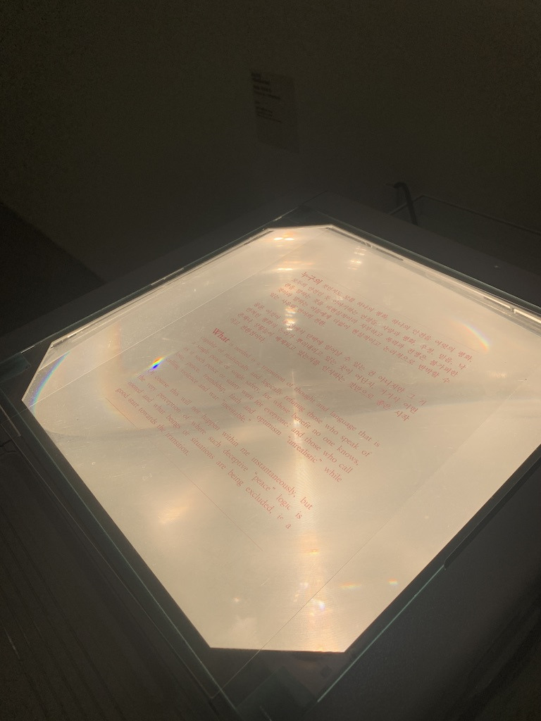 투명지를 기계를 통해 벽으로 쏘아 띄울 수 있는 작품. (초등학교에서 자주 사용했던 것 같은데 이름이 생각이 안 난다.) 단순 이미지 작업으로는 표현되기 어려운 내용을 영상이나 텍스트로도 전시하여서 전시의 전반적인 이해를 높이는 것 같다.