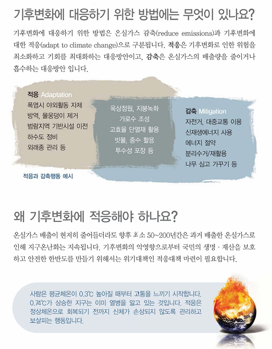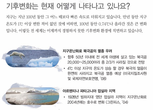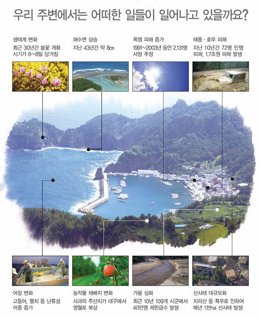 차제에, 우리나라 환경부 홈페이지에서, 2010년 11월 3일에 게재한 브로슈어를 자세히 살폈다. 현재, 한반도를 비롯한 지구의 전 인류가 맞닥뜨린 지구 온난화의 현실을 잘 정리했다.