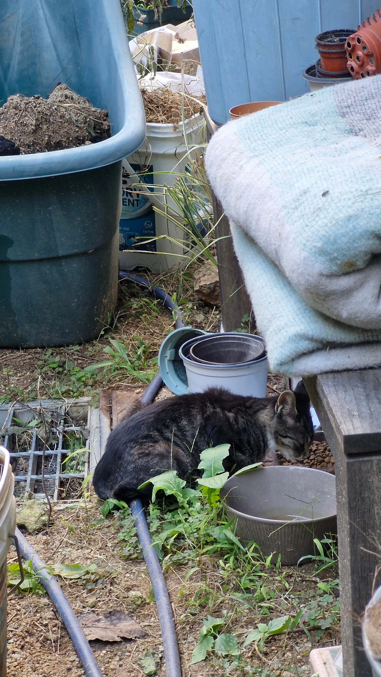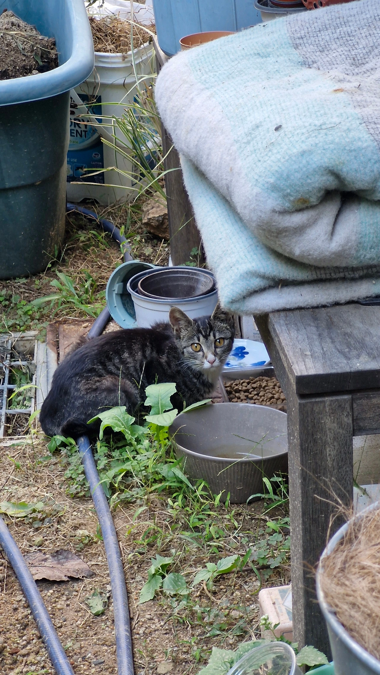 얼마 전에는 아빠로 추정되는 고양이를 보았는데 확실하지는 않다. 그냥 새끼고양이 한마리와 같은 고등어 무늬이다. 마당에서 태극권을 하고 있을 때 나타났는데 우리는 서로 초면이었다. 그래서인지 나를 보고 고등어 고양이는 밥자리로 쉬이 접근하지 않았다. 천천히 그리고 소리없이 태극권 동작을 이어가도 고양이는 긴장을 늦추지 않고 내가 얼른 끝내고 떠나가기를 기다렸다. 나는 그날 초면인 고양이도 도망치지 않게 할 정도로 고요하게 태극권을 하는 것을 배우게 되었다.