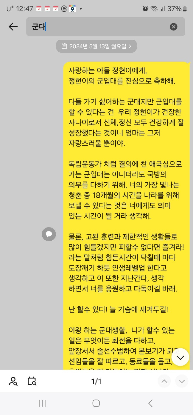 독립운동가 처럼 결의에 찬 애국심으로 가는 군입대는 아니더라도 국방의 의무를 다하기 위해, 너의 가장 빛나는 청춘 중 18개월의 시간을 나라를 위해 보낼 수 있다는 것은 너에게도 의미 있는 시간이 될 거라 생각해.
