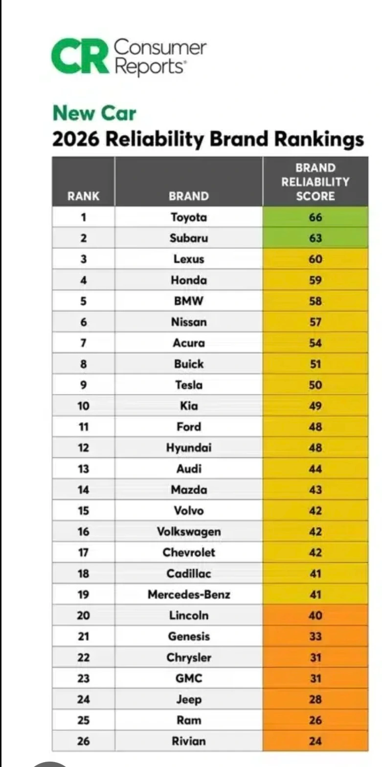 일본차 신봉자는 아니지만, 수십 년째 매년 발표되는 미국 컨슈머리포트의 Reliability 순위 탑 20에는 대부분 일본 브랜드들이 포진해 있다. (도요타, 렉서스, 혼다, 스바루 등) 다행히도 한국의 자랑스러운 현대와 기아도 순위에 있으며, 포드를 제외한 악명 높은(?) 미국 브랜드들은 좀처럼 찾아보기 힘들다. 즉 Ram, Jeep, GMC, 크라이슬러 등 미국차들은 잔고장에서 자유롭지 않다는 방증이기도 한다.