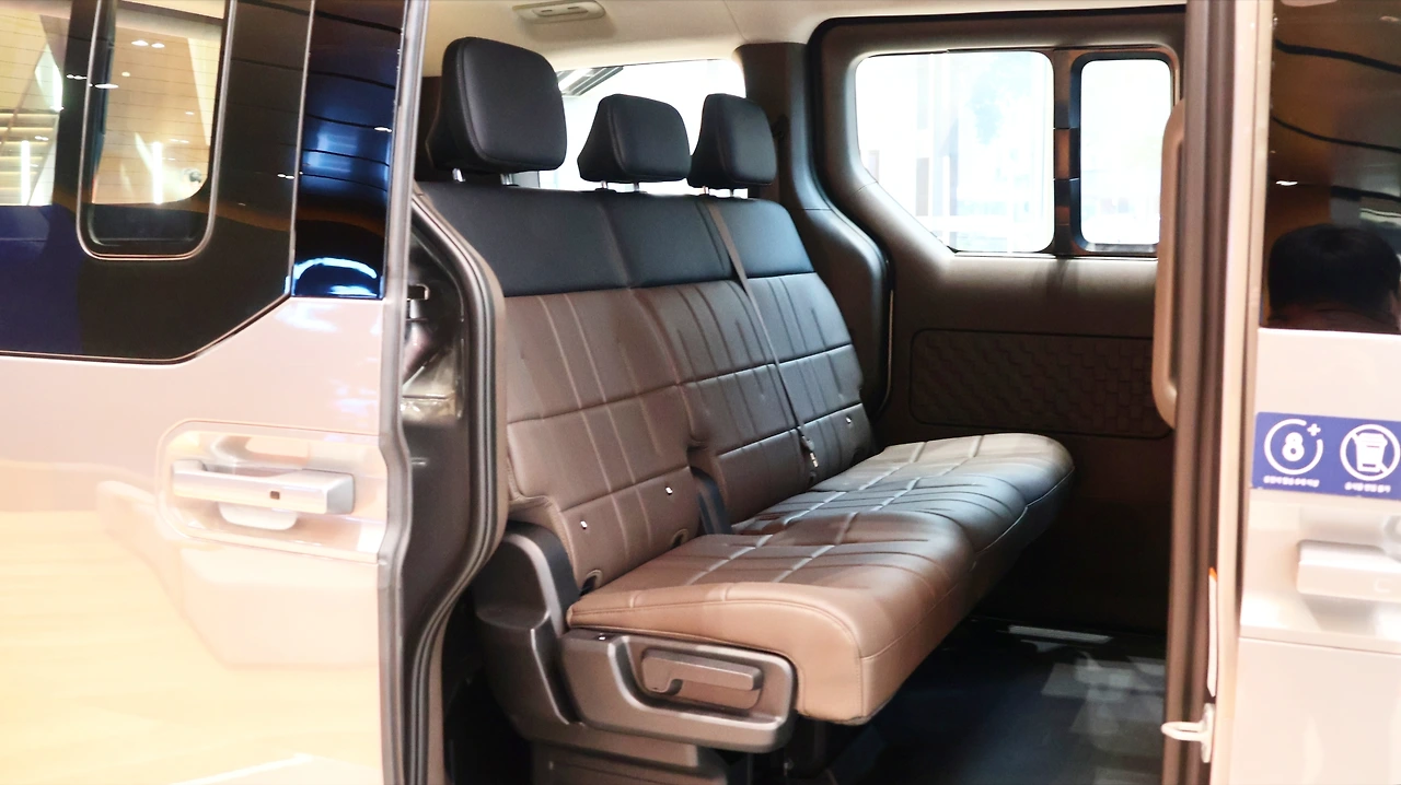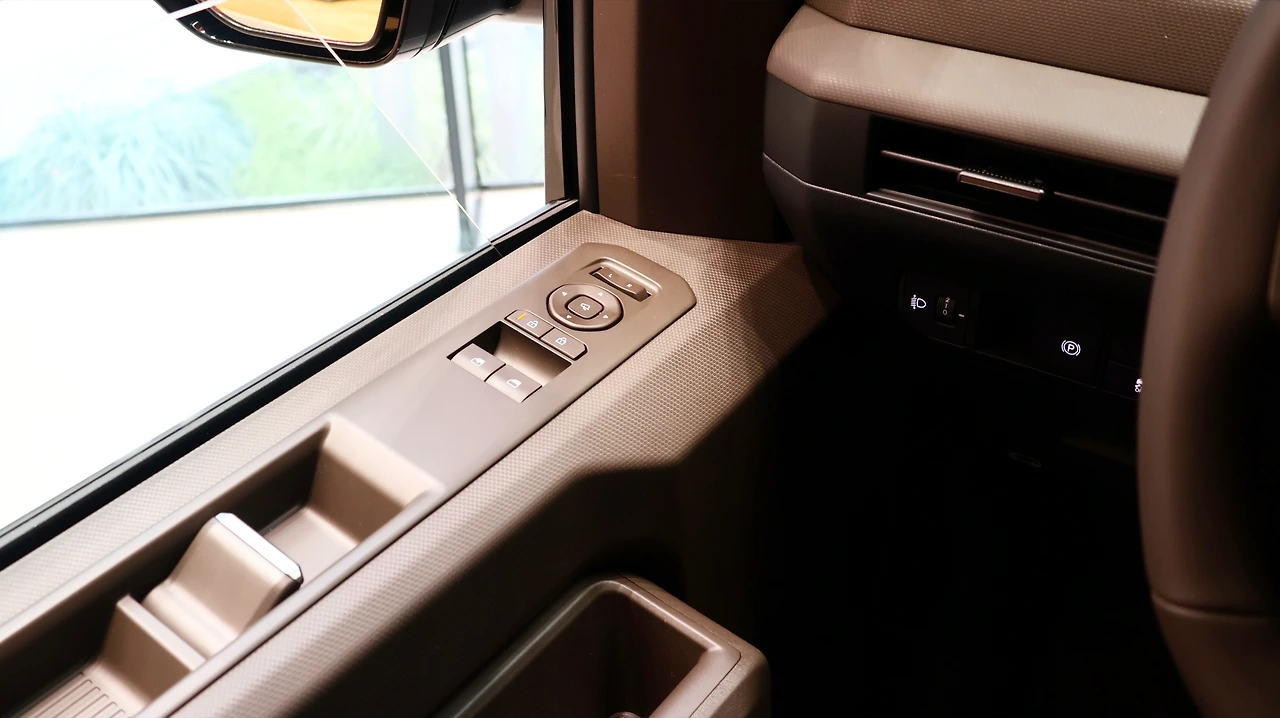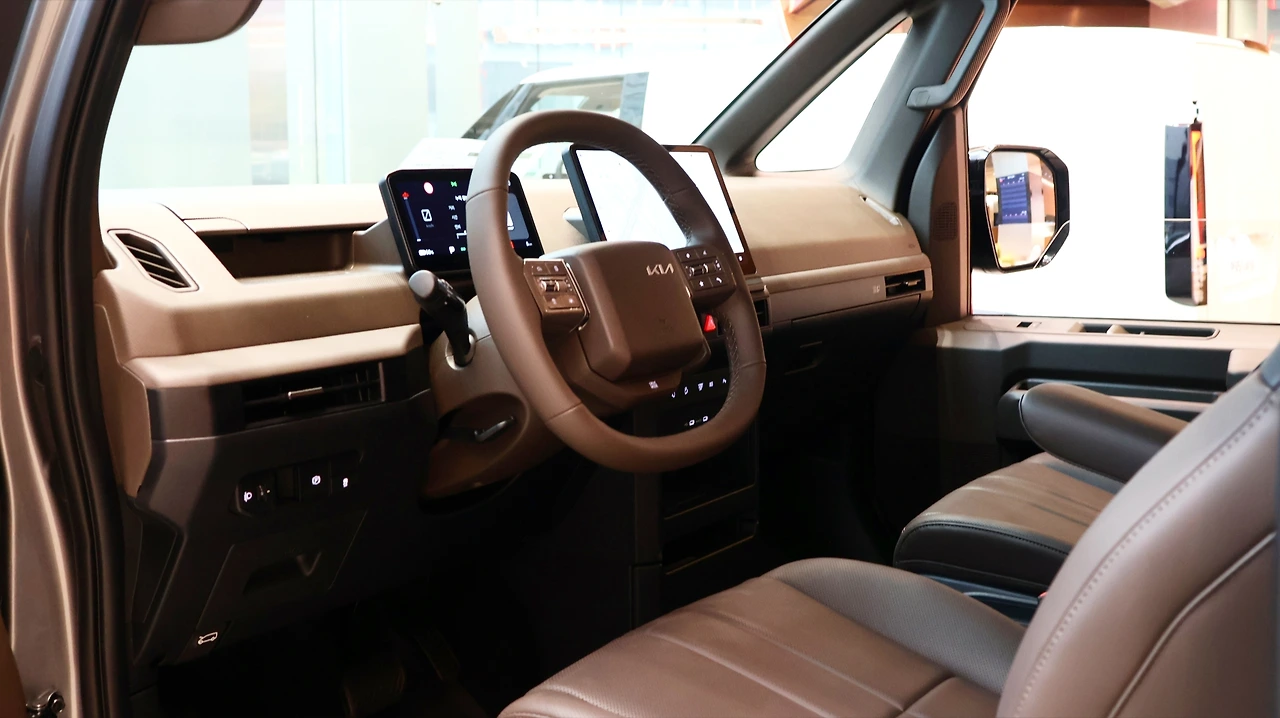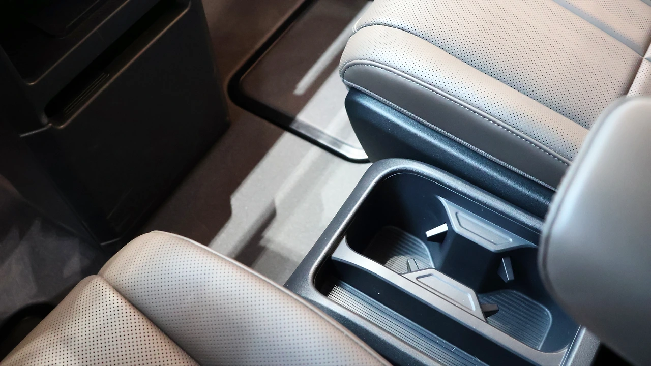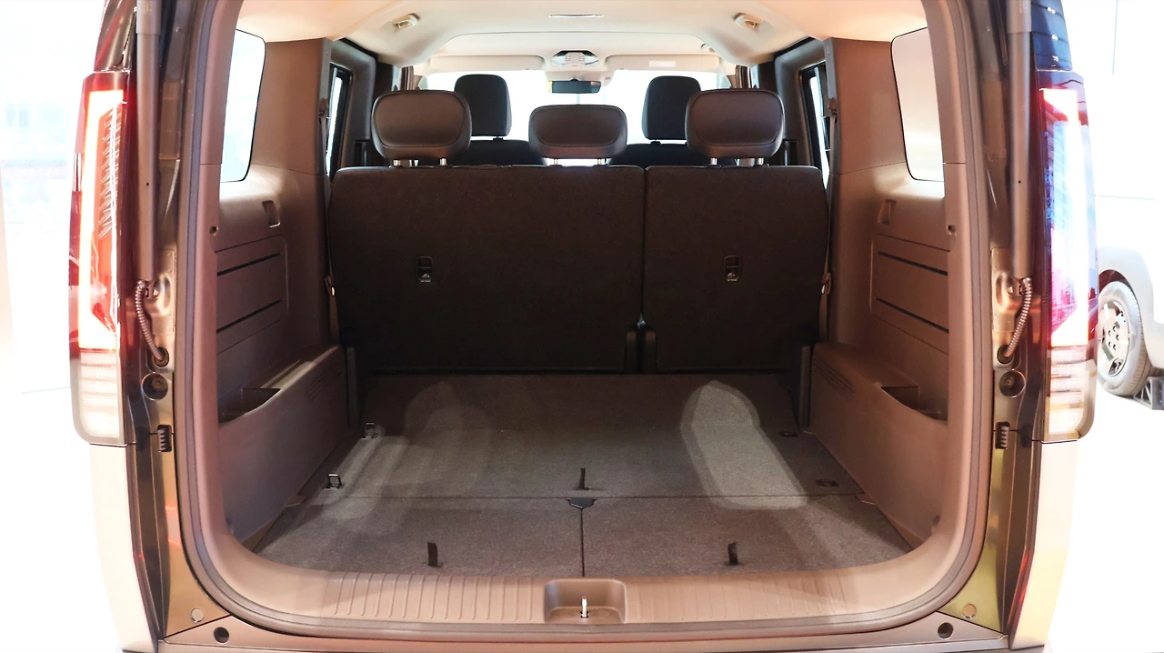 뒷좌석 공간이다. 1열 센터 콘솔에 배치된 실내 V2L은 1,2열이 공유 가능한 위치에 있다. 실내 전고가 원가 높고 바닥면 또한 평탄하게 마감하니, 충분한 공간의 레그룸도 사진으로는 강조되지 않아 보인다. 시트는 인조가죽으로 마감되며, 2열에는 열선 기능만 탑재되었다. 또, 수동식 리클라이닝이 가능하며 폴드&다이브 기능으로 평평하게 접을 수 있다. 뒷좌석 시트가 적용되어도 적재 공간의 용량은 상당히 넓다. 러기지 보드로 높낮이가 맞추어져 있고, 하단부에 추가 수납공간이 마련된다. 그만큼 테일게이트 면적이 정말 넓은데, 옵션으로 전동 기능을 추가할 수 있다.