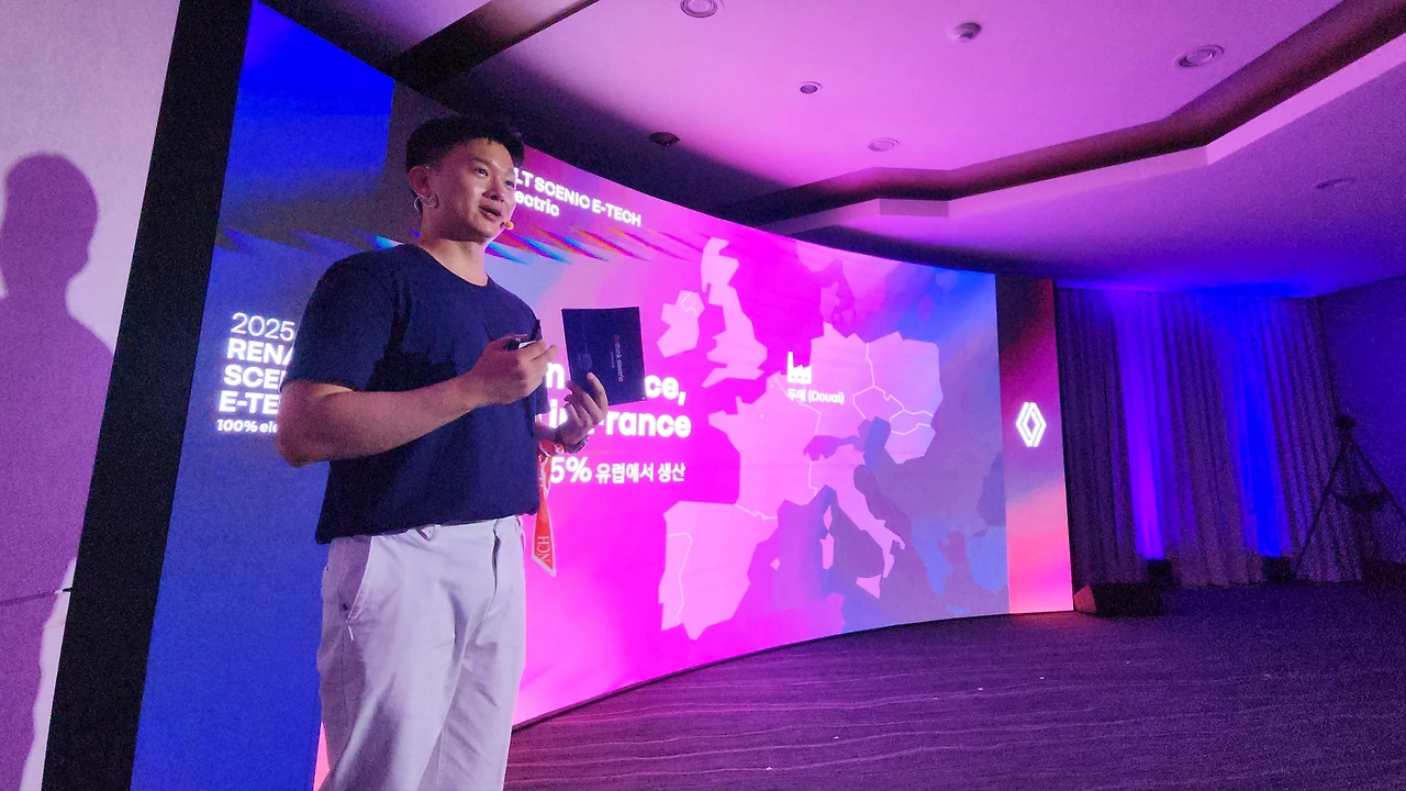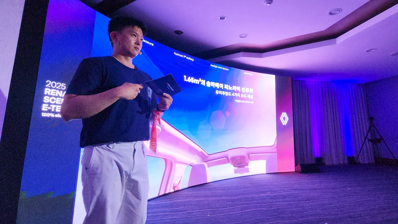앞서 언급한 두 차종이 '프랑스에서 태어나, 한국에서 만들어진다'라는 슬로건을 지니고 있다. 반면 세닉 E-테크는 85%의 부품이 유럽에서 생산되는 본격적인 프랑스 태생의 전기차라는 특징이 있다. 그 디자인과 실용성은 높은 평가를 받으며 '2024 유럽 올해의 차'로 선정되는 영광을 누리기도 한다. 프레젠테이션에서는 르노 세닉 이테크의 세일즈 포인트를 총 4가지로 구분하여 강조하였다. 첫 번째는 '운전의 즐거움', 세닉 E-테크 100% 일렉트릭은 록투록 2.34도의 민첩한 스티어링 감각과 10.9M의 짧은 회전 직경을 보인다고 설명했다.