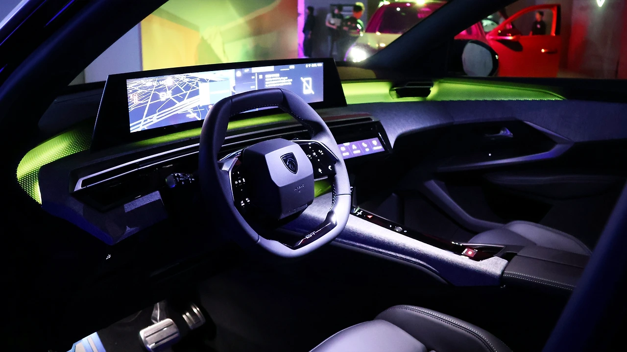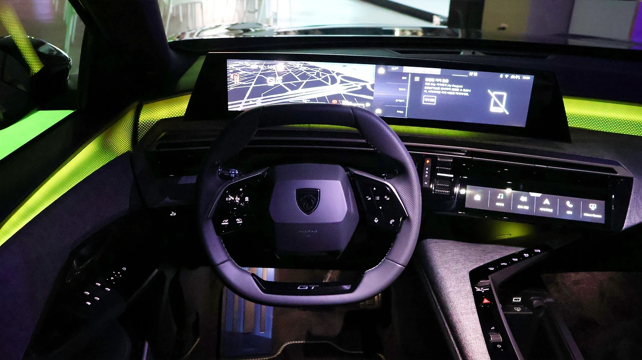 실내 디자인에는 21인치 파노라믹 커브드 디스플레이가 압권이다. 중간 베젤 없이 완전히 통합된 형태, 그리고 즐겨찾기 기능으로 구성되는 센터패시아의 i-토글 디스플레이가 사용성과 심미성 모두를 개선해 준다. 또, 이전 모델에 아쉬웠던 앰비언트 라이트가 더욱 넓고 화려하게 적용된다. 직경이 짧은 스티어링 휠은 푸조의 오랜 특징, 센터 콘솔의 배치와 에어벤트 형상도 기존보다 더욱 파격적으로 변화했다. 패브릭 질감이 느껴지는 대시보드 마감재나 GT 트림에 제공되는 블랙 나파 가죽 시트의 탑승감도 고급스러움이 느껴졌다.