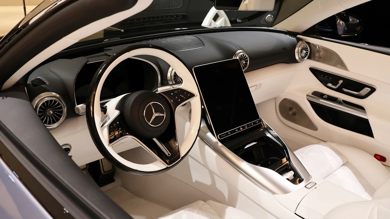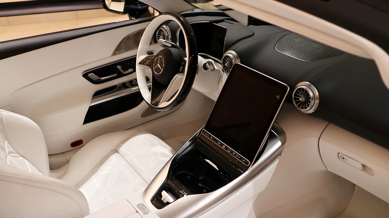 실내 공간이다. 기존 SL과 레이아웃 자체는 동일하지만 차별화된 소재를 적용했다. 도어트림 전체와 대시보드 하단부를 화이트 크리스탈 나파가죽으로 마감했다. 스티어링 휠까지 투톤으로 제공되며, 중앙 스포크 하단에 마이바흐 레터링이 각인된 모습이다. 차량 제어 기능은 대부분 센터 스크린에 통합된 디지털 인터페이스를 지향하며, 센터 콘솔은 수납공간과 탑 개방 버튼으로 구성된다. 마지막으로 시트를 장식하는 복잡한 패턴과 마이바흐 각인이 극적인 호화로움을 느끼게 한다. 생략된 리어 시트 공간은 간단한 적재 공간으로 마감되어 있다.