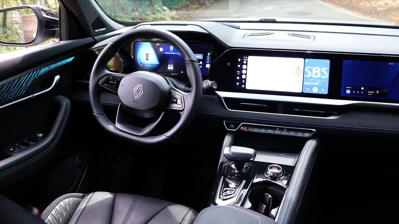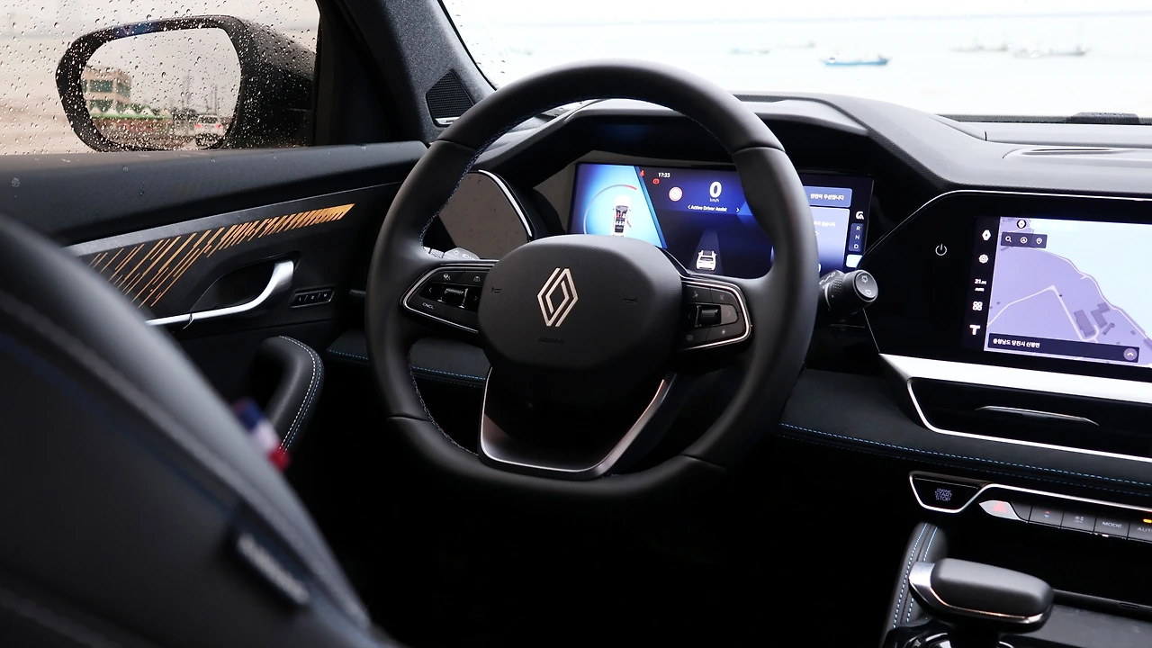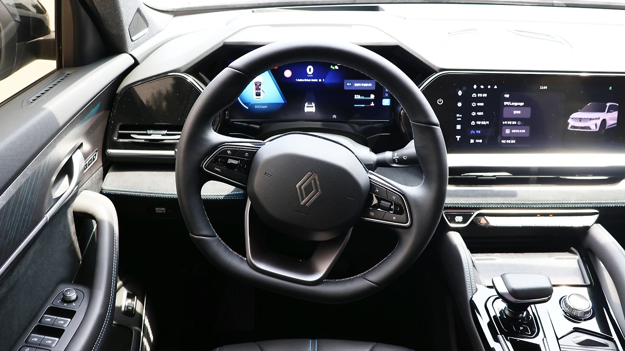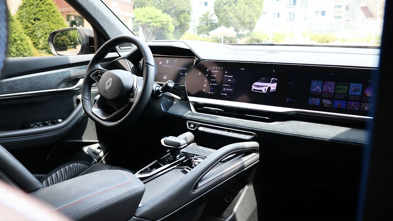 실내 공간이다. TFT 클러스터와 센터 디스플레이, 그리고 동승석 디스플레이까지 총 3개의 12.3인치 스크린을 탑재한다. 르노의 Open R 운영체제를 탑재했으며, 순정 T맵과 AI 음성인식 NUGU 오토 등 디지털 UI를 지원한다. 그와 함께 통풍시트 등 일부 편의 기능을 센터 스크린에 통합한 모습인데, 직관성이 떨어질 수 있는 부분은 음성인식 기능으로 보완하고자 하는 의도를 보인다. 참고로 조수석 스크린은 운전석에서 보이지 않고, HUD는 증강현실 길 안내를 지원했다. 센터 콘솔은 브리지 타입으로 수납공간을 구성했고, 기어 레버는 전자식이다.