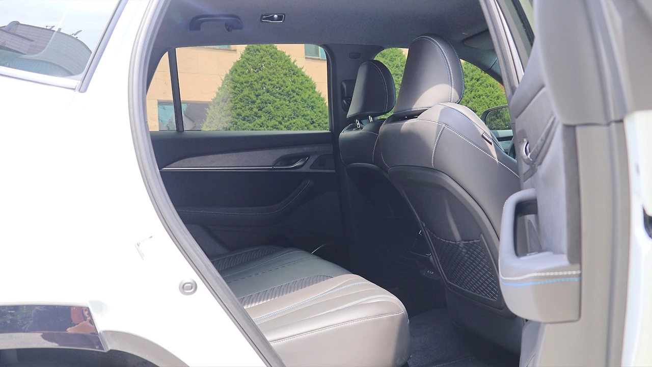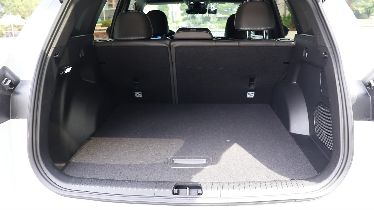 2열 공간이다. 그랑 콜레오스는 중형 SUV 대비 레그룸이 다소 좁은 편이고, 헤드룸이 넓게 느껴진다. 비교했을 때 그렇다는 점이지, 레그룸 공간 자체는 패밀리카 용도로 넉넉하다. AWD 적용으로 인해 센터터널이 솟아 있는 편이고, 선루프 추가가 불가능하다는 점은 단점이다. 기본 편의 기능은 2열 독립 공조와 시트 열선, C타입 충전 포트, 암레스트 컵홀더 정도로 구성되었다. 2열 시트도 에스프리 알핀 등급만의 감성적인 디자인 마감이 제공된다. 트렁크는 바닥면이 평탄하게 마감되어 있다. 보드 아래 잔여 공간과 2열 시트 폴딩 등 확장성을 지닌다.