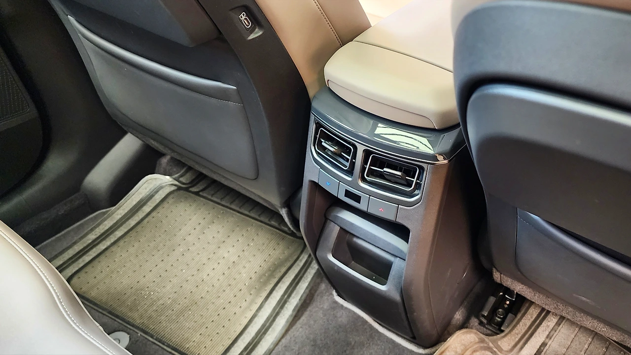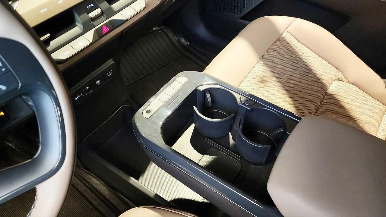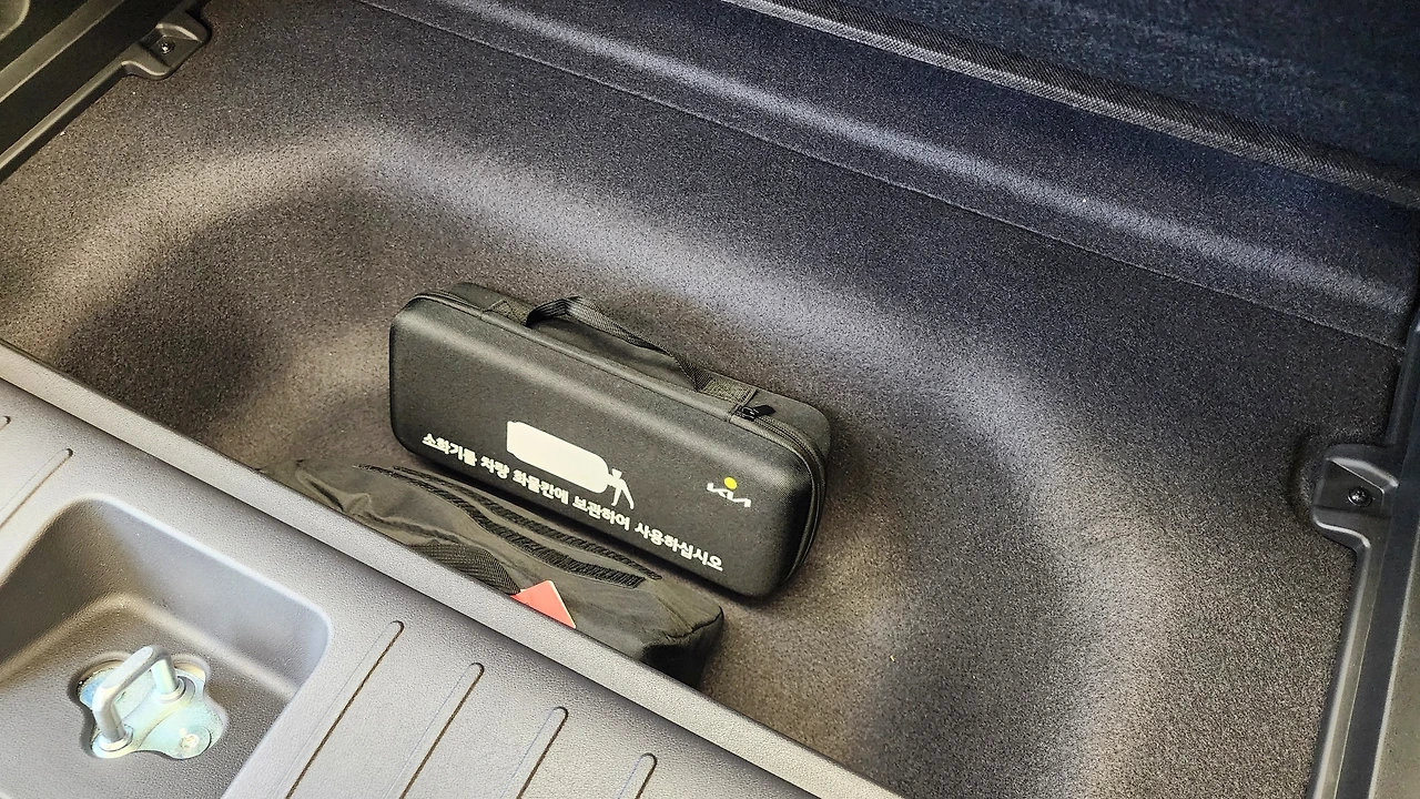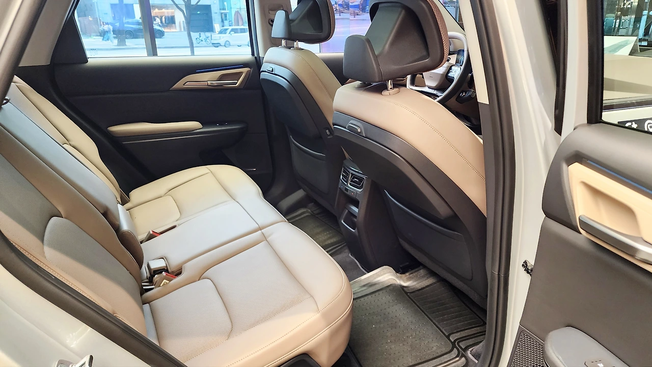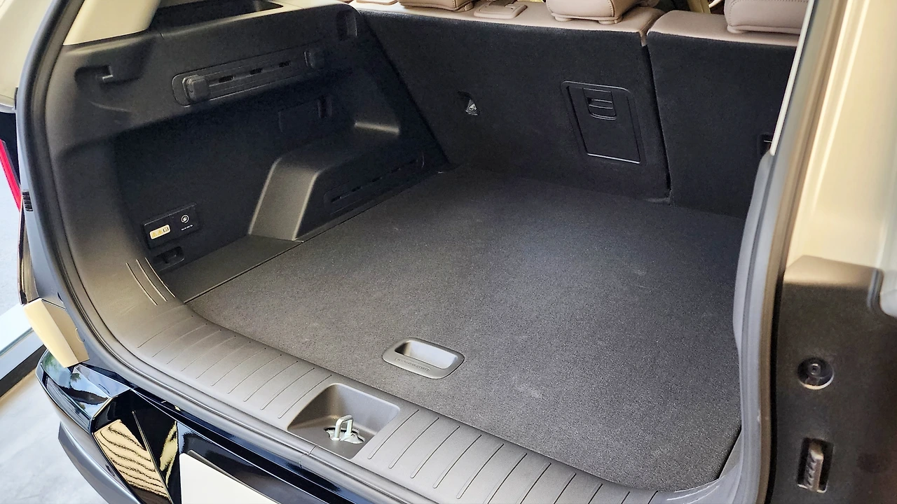 전기차의 이점을 잘 살려낸 뒷좌석 공간이다. 바닥면은 센터터널까지 평탄하게 마감되어 있으며, 파노라믹 선루프 옵션을 제공하는 헤드룸이 정말 여유롭다. 반면, 레그룸 높이가 다소 낮은 감은 있다. 2열 편의 기능으로 암레스트 컵홀더와 에어벤트, 열선 시트는 물론, 2열 독립 공조기와 콘솔 슬라이딩 트레이가 추가되어 있다. 1열 시트백 테이블과 옷걸이로 활용성을 더하는 모습이다. 트렁크 공간도 넉넉하며, 2열 시트를 평탄하게 접을 수 있다. 그에 따라 매트 하단부에도 잔여 공간이 있고, 트렁크에는 실내 V2L까지 적용되어 있었다.