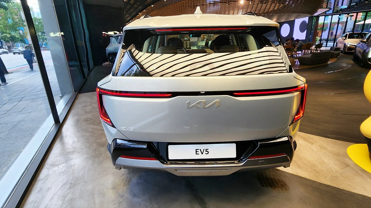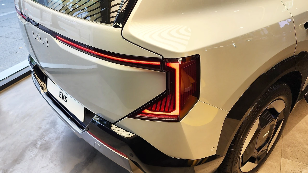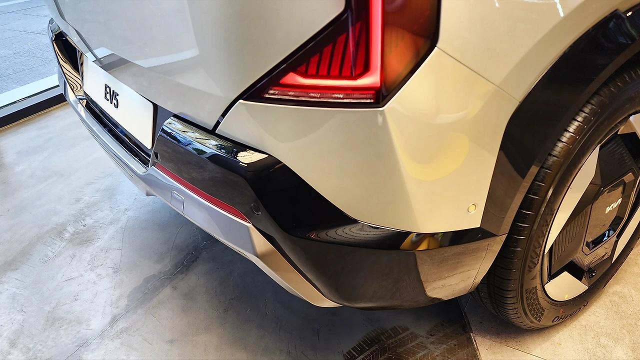 기아 EV5의 외관은 기존 EV 시리즈의 패밀리룩을 따른다. 하나로 이어진 스타 맵 시그니처 라이팅이 가장 큰 특징, 대형 라디에이터 그릴을 생략하여 더욱 대담하고 단단해 보이는 이미지를 연출한다. 범퍼에는 두꺼운 가니시 몰딩을 부착하여 SUV의 성격을 강조했다. 측면 디자인 또한 뚜렷한 라인은 없지만, 앞뒤 펜더의 볼륨감을 강조하여 역동적인 실루엣을 보여준다. 휠 아치 가니시도 두껍게 마감, 휠 사이즈는 19인치로 세팅된다. 테일램프 그래픽은 전면과 닮아 있습. 역시 두꺼운 범퍼와 가니시 몰딩이 특징이다.