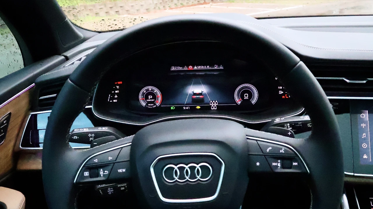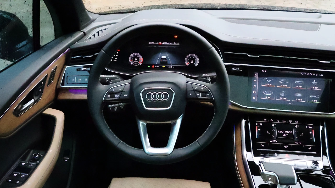 아우디의 상징과 같은 기계식 콰트로의 안정적인 구동력 배분도 고급스러운 주행감을 느끼게 해주는 요소다. 직진성이나 코너링 안정성 모두 수준급, 묵직한 핸들링 감각에서 느껴지는 안정감이 매력적이다. 조향 감각 자체는 준대형 SUV 다운 다소 둔감한 세팅이긴 하다. 평소에는 약간의 언더스티어 경향이 있긴 하지만, 급격한 선회에서는 올 휠 스티어링이 개입하여 회전반경을 적극적으로 줄여준다. 특히 이번 시승은 강한 비가 쏟아지는 날씨였는데, 콰트로 시스템을 바탕으로 한 안정적인 트랙션은 무한한 신뢰를 주었다.