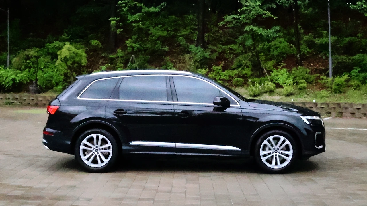 측면 디자인이다. Q7은 동급 SUV 중에서도 전장이 굉장히 긴 편에 속한다. MLB EVO 플랫폼 특성상 프런트 오버행이 길 수밖에 없는데, 그 이상 휠베이스와 리어 오버행의 길이가 연장된 느낌이다. 길게 뻗어있는 보닛과 그린하우스 형상이 여유로움을 전해주기도 한다. 기본 사양은 바디 컬러 클래딩이 채택되지 않았는데, 언더 가니시 면적 자체가 좁다 보니 크게 아쉬운 느낌은 아니다. 윈도우 라인을 장식해 주는 크롬 몰딩이나 사이드 가니시, 루프레일이 나름의 디자인 포인트가 되어준다.