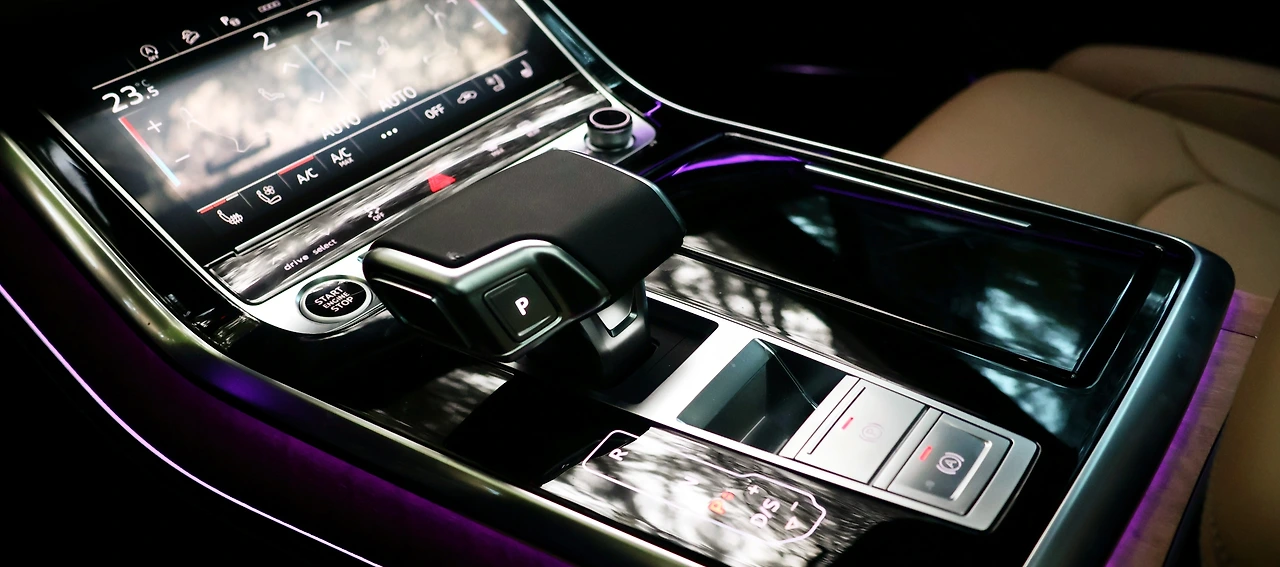 1열 공간이다. 약 12.3인치 버추얼 콕핏 플러스와 MMI 디스플레이, 그리고 공조 디스플레이와 HUD로 인터페이스를 구축했다. 터치 인터페이스는 햅틱 반응을 더해 직관성을 살리고, 센터 콘솔은 컵홀더와 플로어 시프트 타입 기어 레버로 구성된다. 1열 시트는 통풍과 메모리 기능은 물론 마사지 기능을 지원하며, 대시보드는 전부 인조가죽 패키지로 마감되어 있다. 전체적인 대시보드 디자인은 블랙 하이그로시 패널과 유칼립투스 내추럴 인레이를 적용했고, 앰비언트 라이트나 19스피커 B&O 3D 서라운드 시스템 사운드 등 화려한 장비가 기본이다.