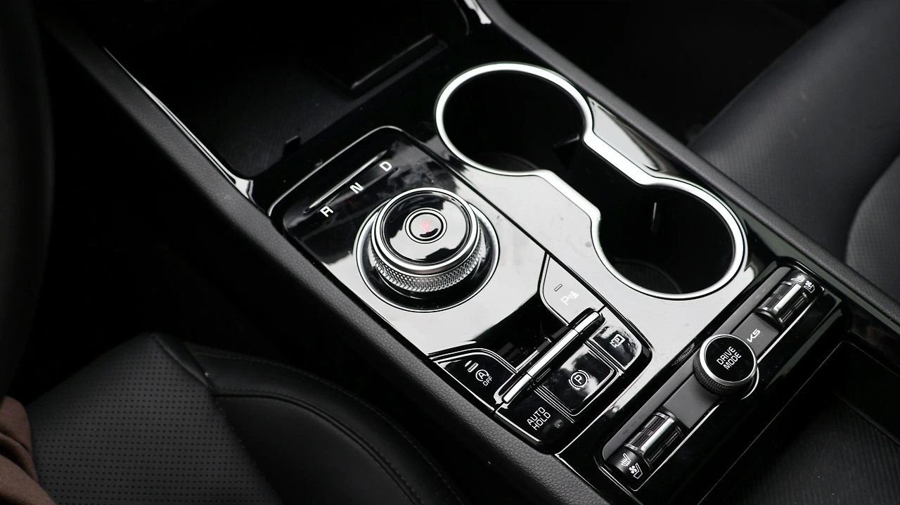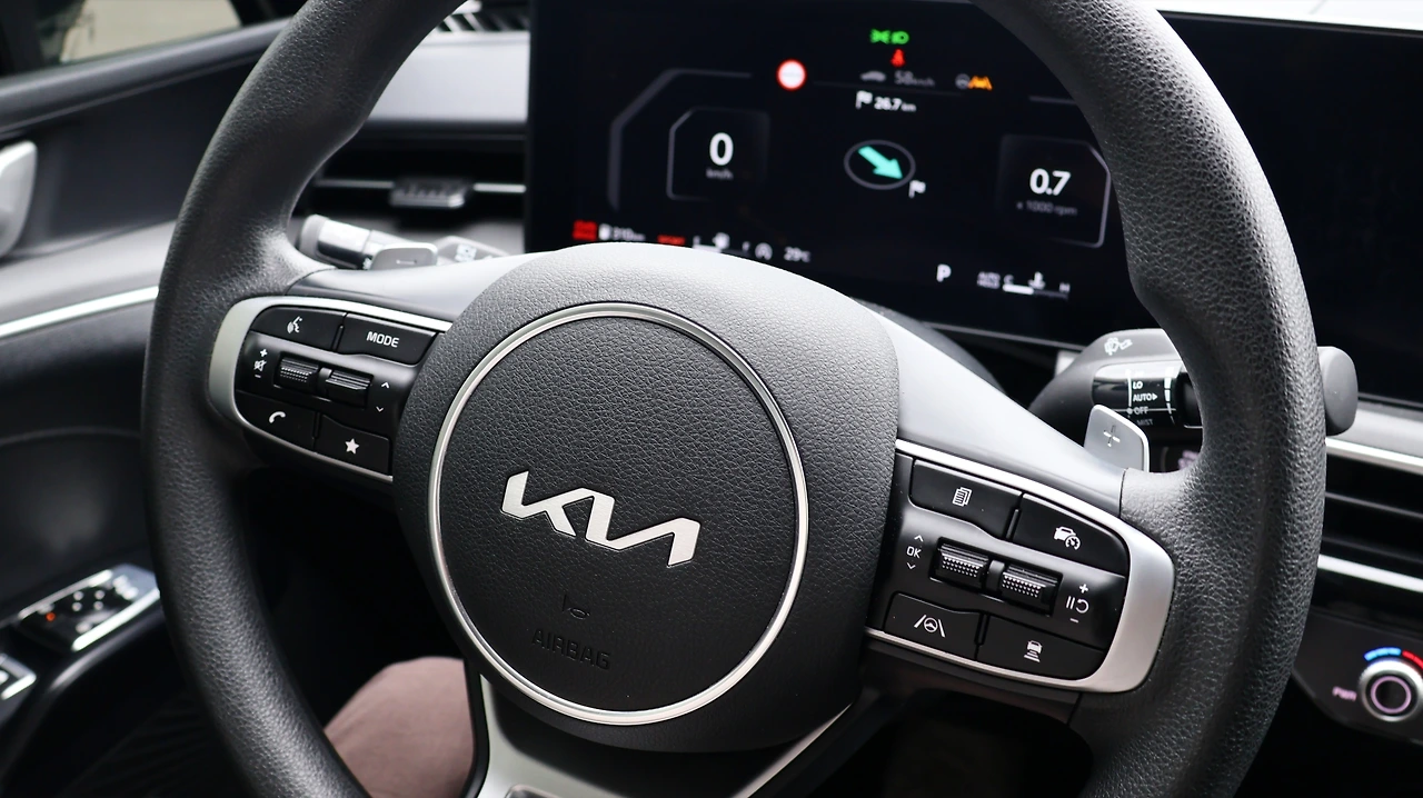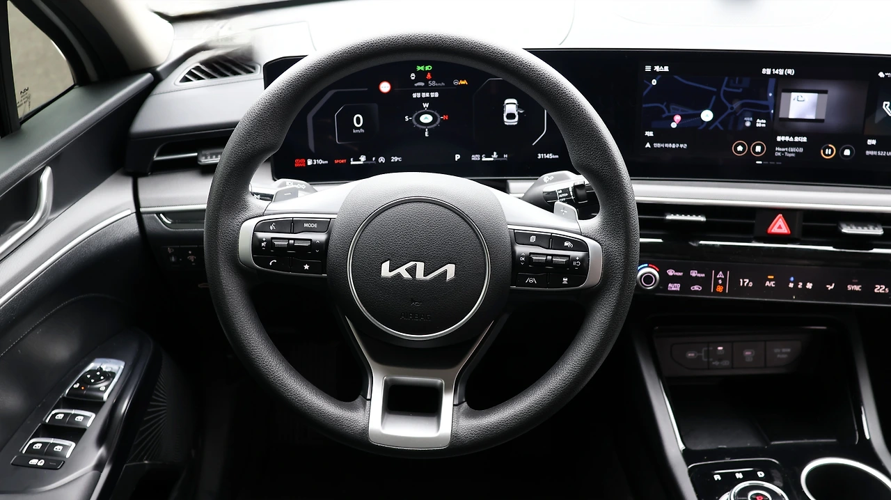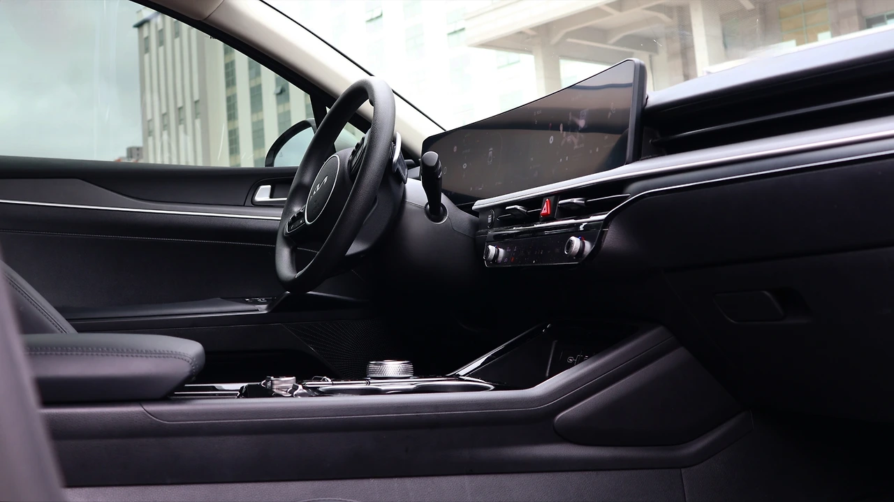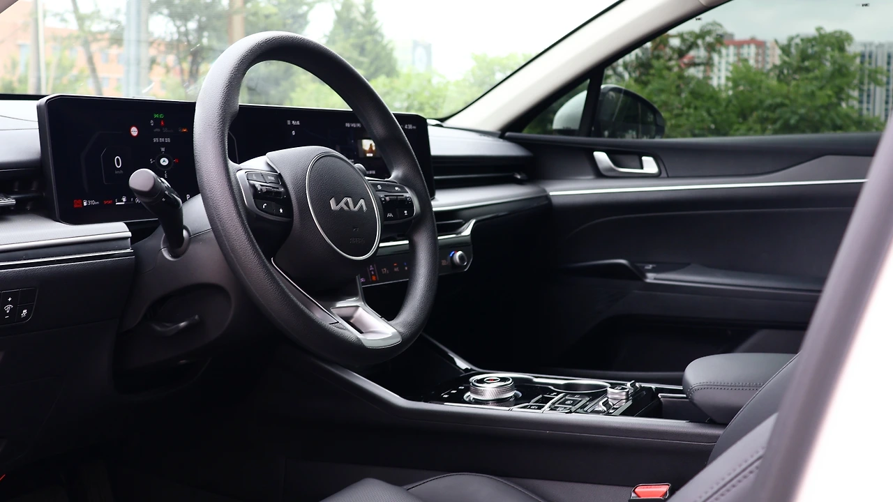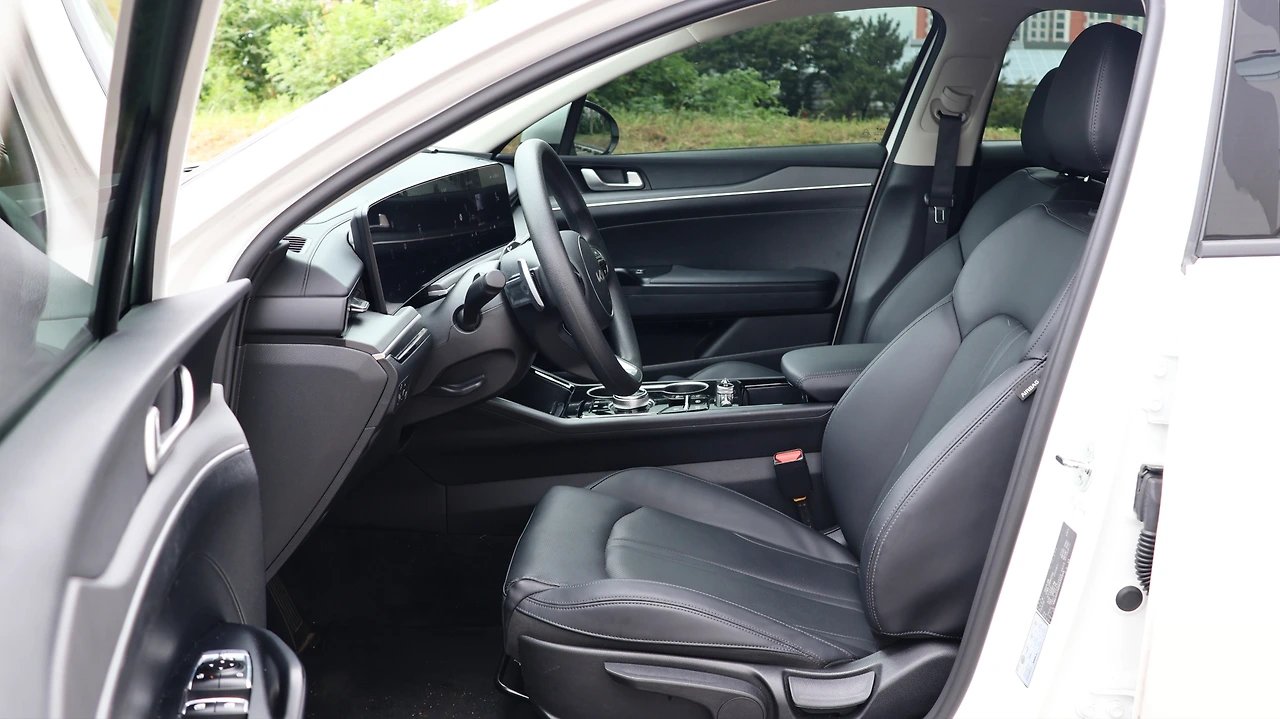 기아 K5 프레스티지 등급의 실내다. 시승 차량은 오직 '12.3인치 클러스터 팩'만 추가되어 있었다. 12.3인치 컬러 디지털 클러스터, 하이패스, 그리고 레인센서와 터치 타입 2존 풀 오토 에어컨, 오토디포그, 공기 청정 시스템으로 구성된 패키지다. 가격은 104만 원, 정말 '가성비'만 본다면 필수적인 옵션은 아닌 것 같다. 여담으로, K5는 12.3인치 내비게이션이 기본이다. 기본 클러스터도 디지털 방식이라서, 기본 등급도 실내 구성 자체는 준수해 보일 수 있다. 블랙 하이그로시 패널과 전자식 변속 다이얼도 기본 적용이다.