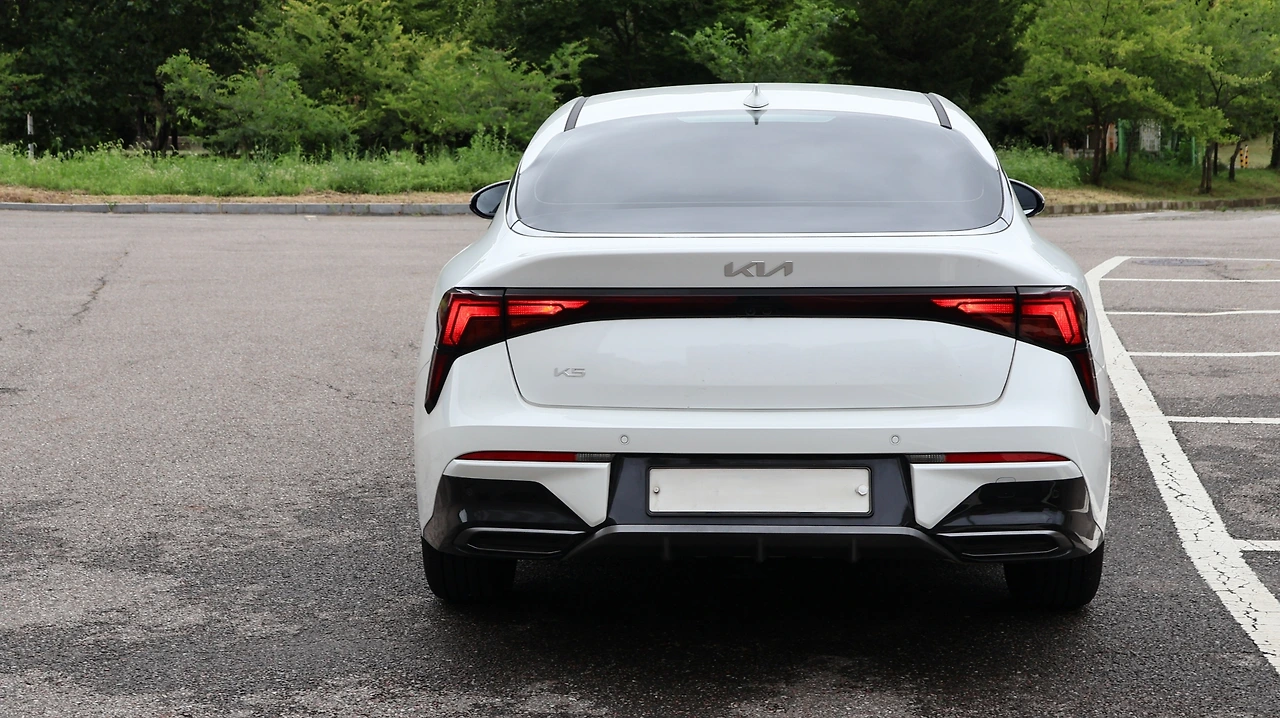 더 뉴 K5는 기존 디자인보다 정제되면서도 날카로운 디자인으로 다듬어졌다. 기아의 오랜 상징이던 타이거 노즈 그릴과 GT 라인을 연상시키는 스포티한 범퍼가 특징이다. 패스트 백 라인으로 뻗어나가는 C필러, 이를 가르는 윈도우라인 몰딩은 K5의 오랜 디자인 헤리티지다. 페이스리프트 이후 테일램프는 더욱 길게 확장된 바 있다. 다만, 기존 금형을 유지하다 보니 디자인 자체는 다소 어색하다. K5의 비율 자체가 잘 조율되어 있으니 억지스럽게나마 소화해 내는 모습, 디퓨저가 자리한 리어범퍼는 여전히 매력적인 디자인 요소다.