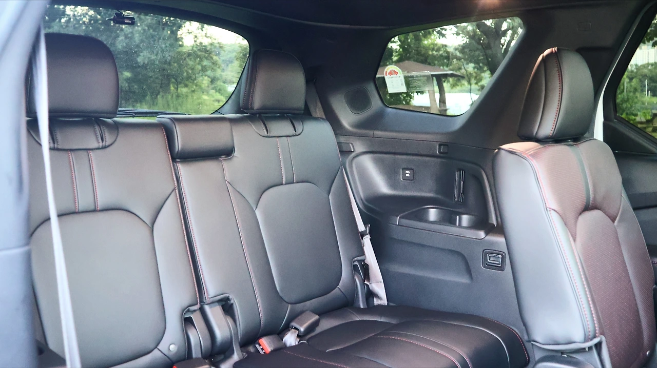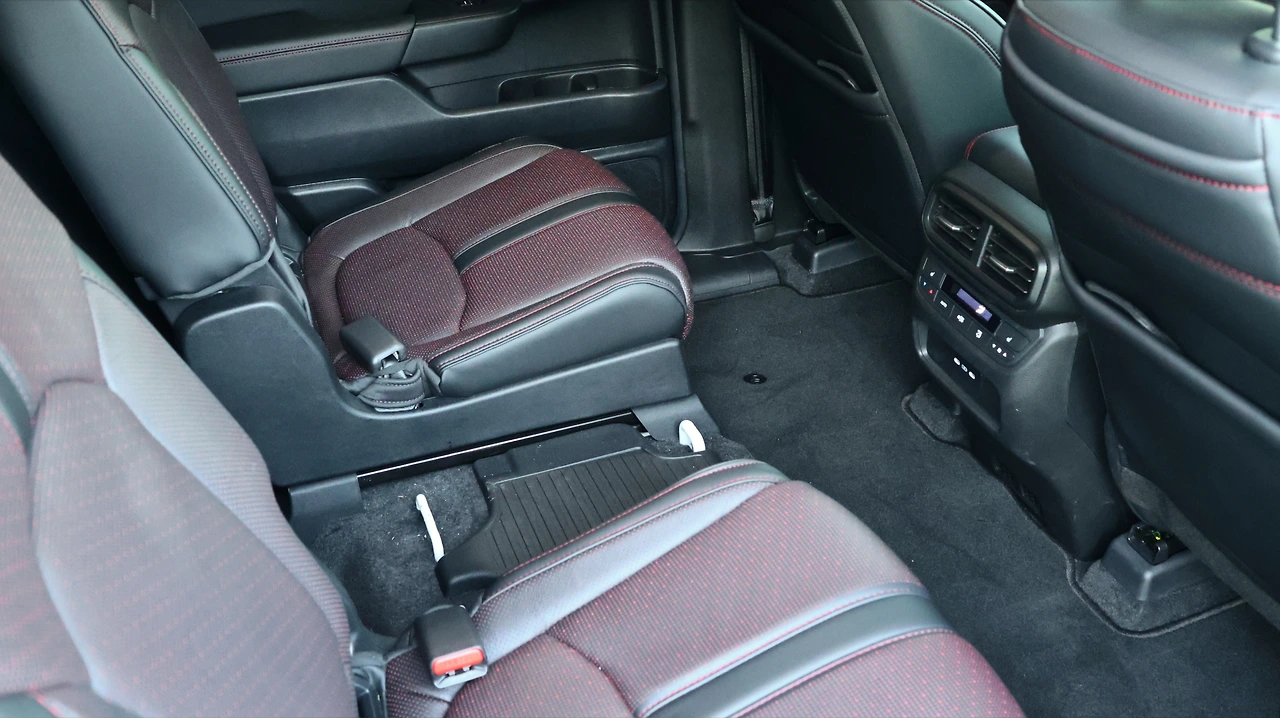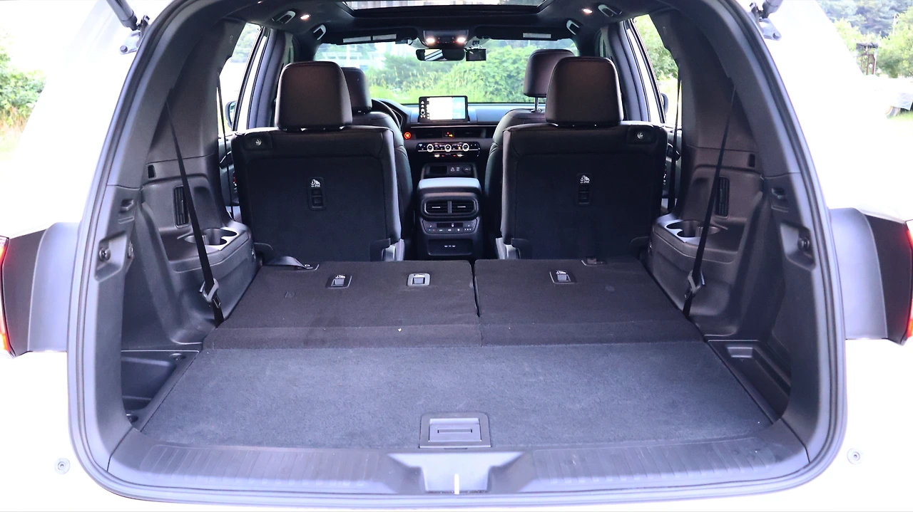 2열 센터 시트는 폴딩 하는 경우 대용량 센터 콘솔이 되어준다. 수납공간과 컵홀더를 포함한다. 2열 시트 슬라이딩과 리클라이닝 역시 가능하다. 원터치 워크인 기능까지 적용되어 3열 시트는 편리하게 승하차할 수 있다. 3열도 3인이 탑승 가능하며, 공간 자체도 여유가 있는 편이다. 컵홀더와 에어벤트가 탑재되고, 각도는 6:4 비율로 분리되어 있다. 3열 시트를 펼쳐도 트렁크 잔여 용량이 확보되어 있으며, 좌측에는 파워 테일게이트 버튼이 편의성을 더해준다. 2,3열 시트를 폴딩 하는 경우 바닥면이 수평 형태로 마감되는 모습도 장점이다.