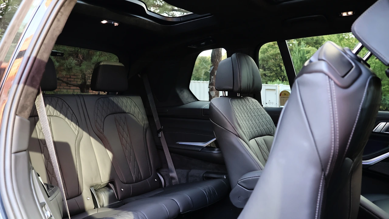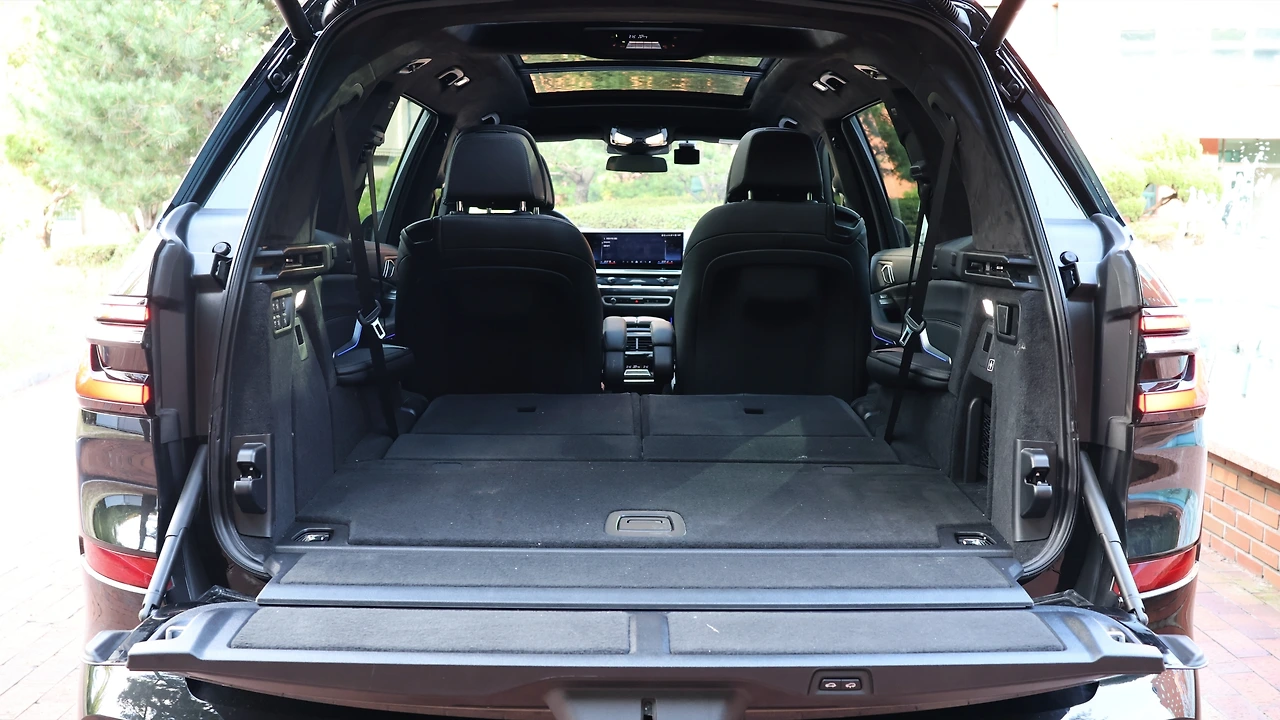 그리고 3열 거주성이 놀랍다. 넉넉한 레그룸을 보유하고 있고, 양옆 시트 간의 폭도 충분히 확보되어 있다. 튀어나온 휠 하우스는 컵홀더까지 마련된 세심함이다. 가장 특별한 점은 3열 공간을 위한 선루프가 별도로 마련되어 있다는 점이다. 개방은 불가하지만, 3열에서 블라인드를 조작할 수 있다. 심지어 3열 독립 공조 기능과 시트 열선까지 포함된다. 3열 시트를 펼쳐도 쓸만한 트렁크 공간이 남고 트렁크 매트 아래에도 넓은 잔여 공간이 있다. 2,3열 시트는 전동식으로 접었다 펼칠 수 있고, BMW의 클램셀 테일게이트는 활용도도 높다.
