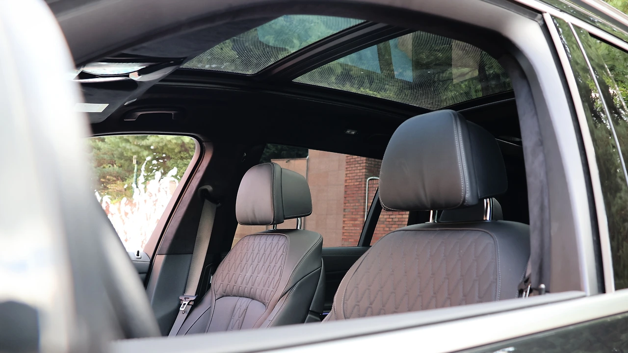 여유롭고 편안한 2열 공간이다. 6인승은 독립 시트로 구성되어 있고, 독립식 전동 리클라이닝을 지원한다. 센터 콘솔에서 시트 열선과 독립 공조기를 조작할 수 있다. 추가로 컵홀더까지 배치된 모습, 도어트림에도 많은 버튼들이 있다. 좌우 측 전동식 롤러 블라인드를 조정할 수 있고, 또 선 블라인드까지 펼칠 수 있다. 아무렴 공간 자체가 워낙 여유롭고 개방적이다 보니 패밀리 SUV로서 만족감이 뛰어날 수밖에 없다. 루프 패널이 최대한 뒤로 밀려나와 있고, 그 사이에 드넓은 면적의 파노라마 선루프가 구성된다.
