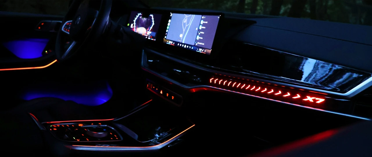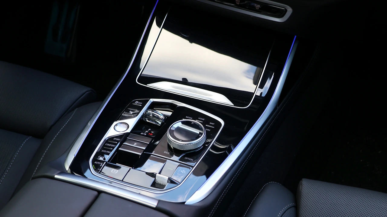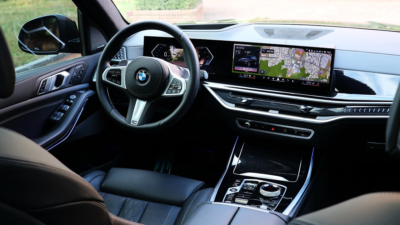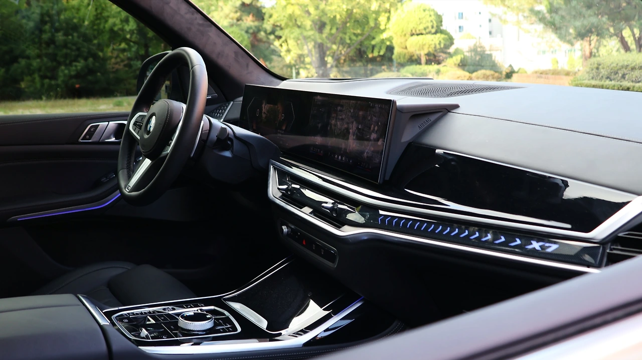 인테리어 디자인이다. 사실 대시 패널 구성 자체는 X5와 큰 차이가 없다. 페이스리프트 이후 12.3인치, 14.9인치 병렬 파노라믹 커브드 디스플레이를 채택했고, 차세대 운영체제가 포함된다. 센터패시아에는 무풍 에어컨을 구현하면서 보다 고급스러운 마감을 갖추고, X7 레터링이 각인된 무드램프를 탑재했다. 기어노브가 크라스탈 소재의 토글 레버로 변경된다. 블랙 하이그로시 패널과 함께 고급스러움을 각인해준다. M스포츠 패키지 전용 스포츠 스티어링 휠, 블랙 헤드라이닝은 BMW다운 실내 분위기를 마무리 짓는다.