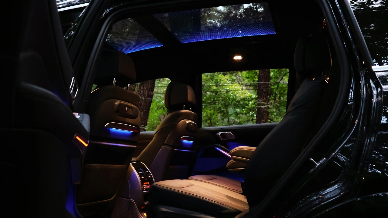 이런 인테리어 디자인은 실제 사용자 만족도가 높다. 자연스럽게 손이 가는 위치에 적재적소의 버튼이 있고, 또 주행 중에 직관적으로 사용할 수 있는 기능들이 다양하다. 무엇보다 X7은 플래그십 SUV인 만큼 포함되는 옵션들이 많다. 메모리 시트는 기본, 1열 마사지 기능과 제스처 컨트롤 센서, 심지어 센터 암 레스트와 도어트림에도 열선이 내장되어 있고, 하만카돈 서라운드 사운드 시스템이 채택되었다. 시트의 착좌감이 정말 편안하다. 그리고 파노라믹 선루프에까지 앰비언트 라이트가 점등된다는 점에 놀랐다.
