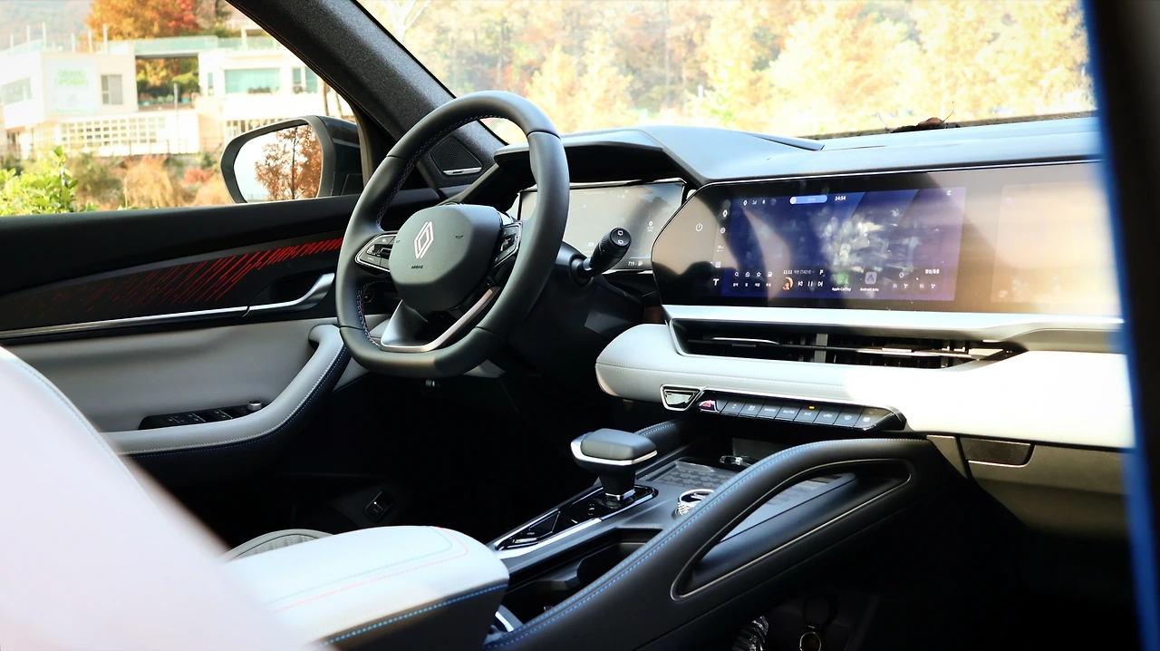 실내 공간이다. 12.3인치 디지털 클러스터와 센터 스크린, 조수석 스크린과 HUD로 인터페이스를 구축한다. 르노의 OPEN R 링크가 적용되었고, T맵 내비게이션과 FLO 스트리밍 서비스가 내장된다. 많은 기능은 센터 스크린에 통합되며, 센터패시아는 주요 버튼만 직관적으로 배치되었다. 기어 노브는 레버 타입, 스티어링 휠은 D 컷이다. 센터 콘솔은 브리지 타입으로 수납공간을 확장했고, 에스프리 알핀 트림은 다채로운 디자인 차별화가 제공된다. 가장 큰 차이점은 나파 인조가죽 시트, 그 외 블루 스티치나 플래그 라벨, 알루미늄 데코 등 고급감이 상당했다.