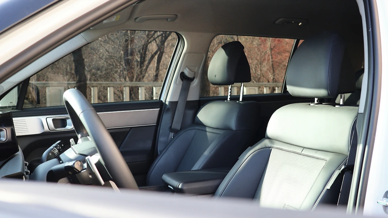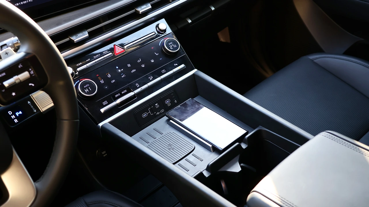 기본 옵션이 정말 다양해졌다고 느낀 부분은 지문인식 센서와 싱글 무선 충전 패드가 기본이기 때문이다. 과거에는 거의 유상 옵션으로만 추가할 수 있었다. 실내에는 헤드라이닝과 필러까지 멜란지 니트 소재로 꼼꼼히 마감하기도 했다. 무엇보다 싼타페는 이전 모델에 비해 실내 공간 활용성이 좋아졌다. 브리지 타입 센터 콘솔은 기존과 같이 여유로운 수납공간을 제공하며, 조수석 측 글로브 박스 상단에 크래시패드까지 수납공간을 구성했다. 센터 콘솔박스는 1열뿐만 아니라 2열에서도 개방할 수 있게 양방향 힌지를 달았다.