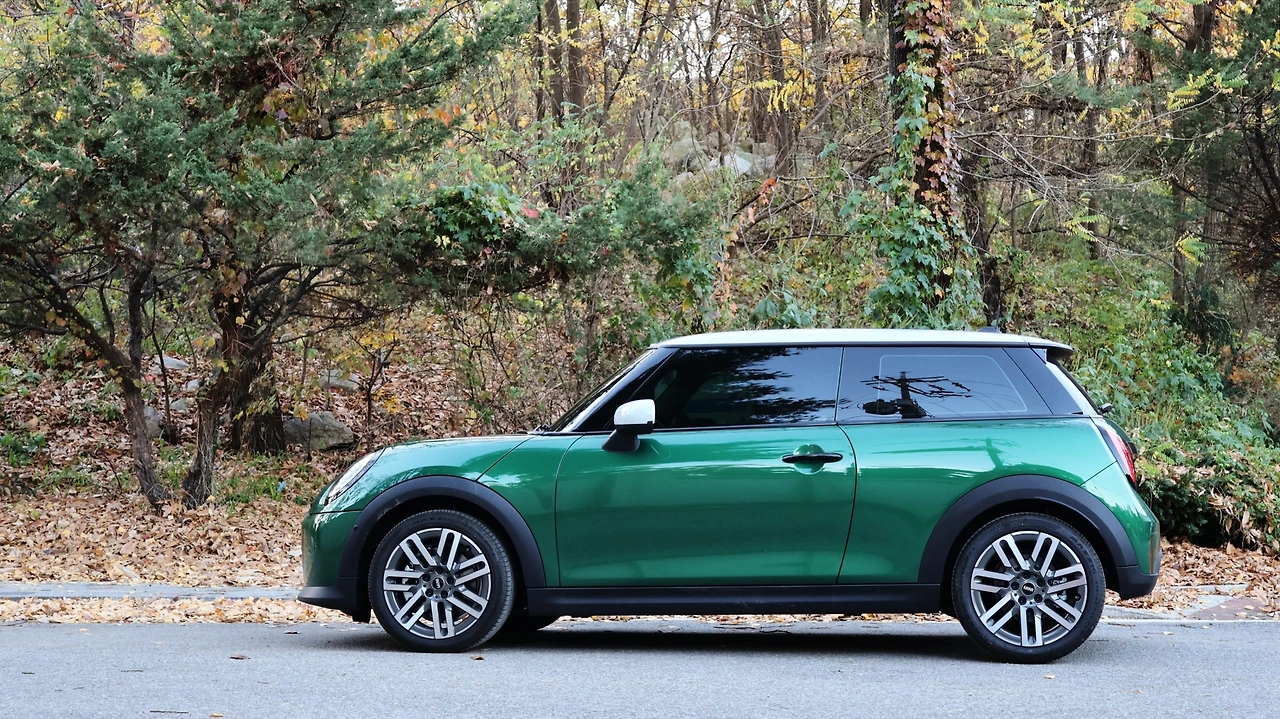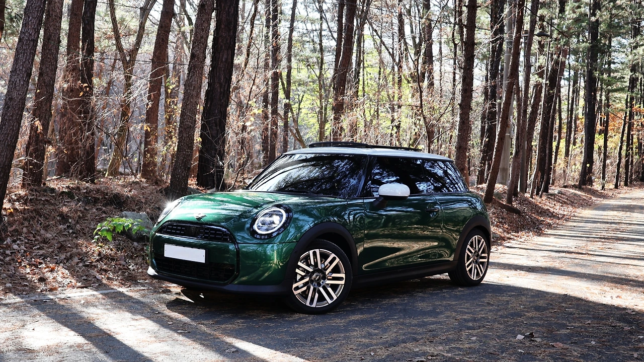 이번 시승 차량에 적용된 브리티시 레이싱 그린 색상은 더욱 고풍스러운 분위기가 있다. 디테일에 많은 공을 들이는 미니답게, 벨트라인 몰딩이나 프레임리스 도어, 랩 어라운드 스타일링 등 마감 품질이 뛰어나다. 쿠퍼 C 클래식 사양만 화이트 루프가 적용되고 사이드 미러 커버까지 색상이 통일된다. 휠은 17인치 투톤 패러랠 경량 알로이 타입, 왜인지 모를 영국스러움이 더해지는 것 같다. 전기 모델과 다르게 기존 플랫폼을 유지한 미니 쿠퍼는 두꺼운 휠 아치 클래딩이 그대로 적용된다. 클램셀 후드까지 고유의 개성을 더했다.