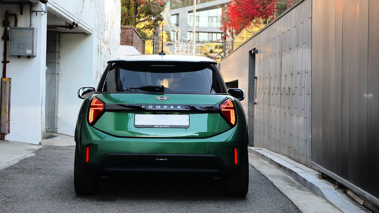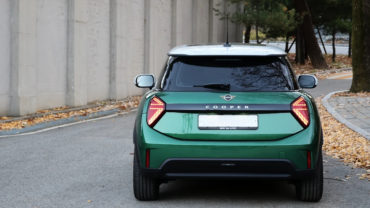 후면 디자인은 비교적 많은 변화를 거쳤다. 테일램프 디자인이 완전히 달라지면서, 거의 삼각형에 가까운 사다리꼴로 변경된다. 유니언 잭 패턴이 각인되어 있던 이전과 다르게 형상 자체가 상징성을 품게 된 셈이다. 그리고 헤드램프와 마찬가지로 3가지 그래픽 설정이 가능했다. 개별적으로 작동하는 내부 LED 그래픽 덕분에 느껴지는 시각적인 화려함도 매력적이다. 양측 헤드 램프는 검은색 가니시로 연결되고, 각 사양에 맞는 엠블럼이 부착된다. 범퍼는 역시 간결한 형태, 머플러 팁이 사라진 점은 다소 아쉽지만 안테나는 여전히 귀엽다.