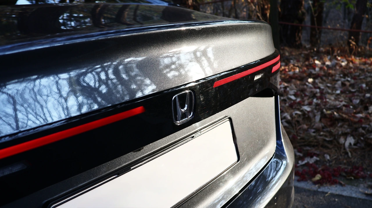 프런트 범퍼 밑부분에서 눈에 띄었던 스커트 형상은 측면과 후면까지 연결되어 차량을 장식해 준다. 어코드 터보의 경우 휠 사이즈는 17인치 타입, 차체에 비해 다소 아담한 느낌은 있지만 섬세한 조형미가 인상적이다. 또, 색감이 어두워 고급스러움을 더한다. 테일램프 역시도 풀 LED 타입, 전후면 턴 시그널도 LED 방식이다. 라이트 커버가 일제형으로 중심부에는 혼다 엠블럼을 각인했고, 이를 수평 형태의 테일램프 그래픽이 강조하는 구성이다. 리어 범퍼는 간결한 형태, 머플러 팁은 생략하였지만 돌출되어 있는 디퓨저가 밋밋함을 덜어준다.