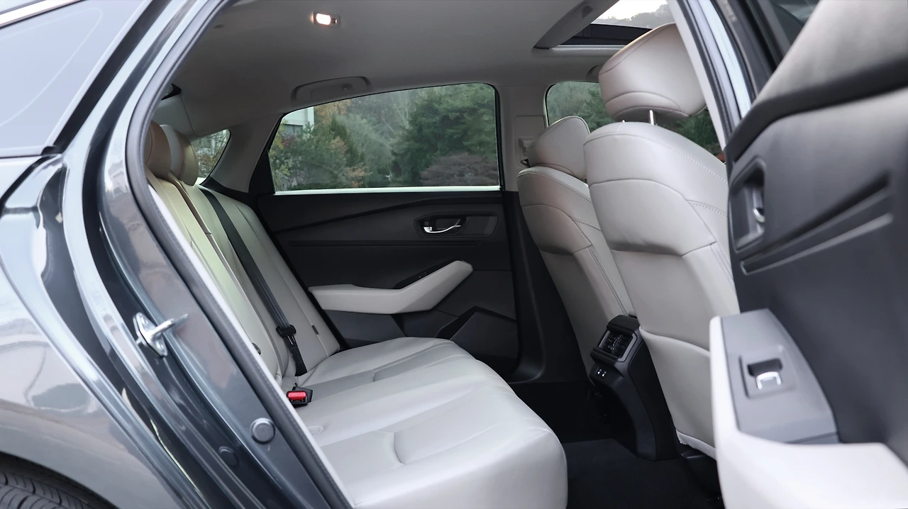 뒷좌석 공간이다. 사실 어코드를 중형 세단이라고만 정의하기엔 차체 크기가 꽤나 큰 편이다. 그에 따라 여유로운 레그룸이 구현되어 있고, 시트 등받이 각도도 기울여져 있는 세팅이다. 편의 기능으로는 에어벤트와 충전 포트, 암레스트 정도가 구성된다. 트렁크는 반자동 방식, 스마트키 버트만으로 개방은 가능하다. 무엇보다 후방 전고가 높아지는 디자인에, 트렁크 바닥면을 최대한 낮게 마감하여 러기지 용량이 기대 이상이다. 내부 마감 품질도 훌륭하고, 리어 시트는 6:4 비율 폴딩이 가능하여 공간을 더욱 넓게 활용할 수 있다.