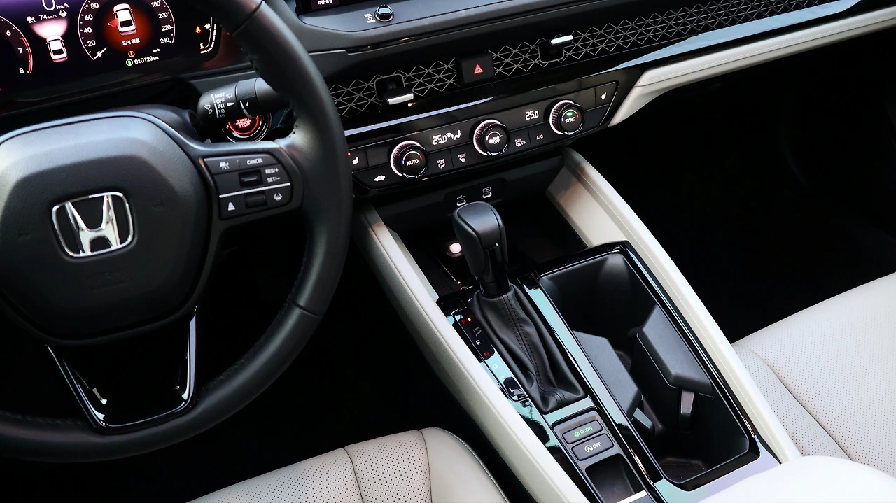 물론 CVT 특성상 재빠른 응답성을 기대하긴 어렵다. 그럼에도 어코드의 리스폰스는 전혀 답답함을 느껴볼 수 없는 수준, CVT의 응답 지연이라기보다는 가솔린 엔진의 특성에 더 가깝다. 터보 래그도 의식하지 않는 한 그 간극이 잘 느껴지지 않는다. 특히 탄력이 붙은 상태에서는 막힘없이 나아가는 가속력이 매력적, 고 RPM에서의 엔진 사운드도 정제된 느낌이다. 즉, 안정감이 좋다. 별도의 주행모드는 효율성을 높여주는 'ECON'만 구성되어 있지만, 어떠한 환경에서든 자연스럽게 뒤따라주는 세팅이 마음에 든다.